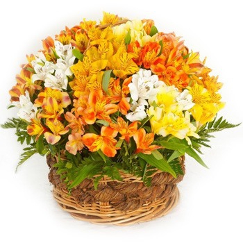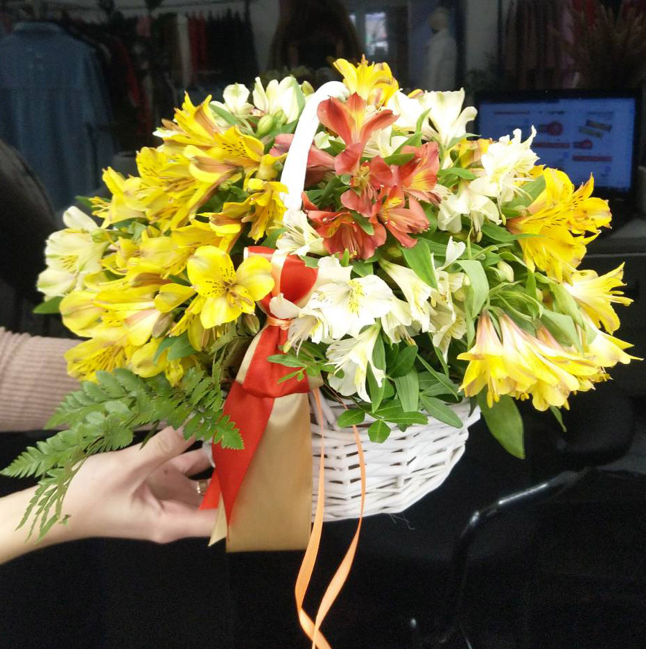 An airy composition of 19 branches bright colors alstroemerias set in a nice basket with greenery will bring much positive emotions to the recipient and will be a real adornment of any celebration