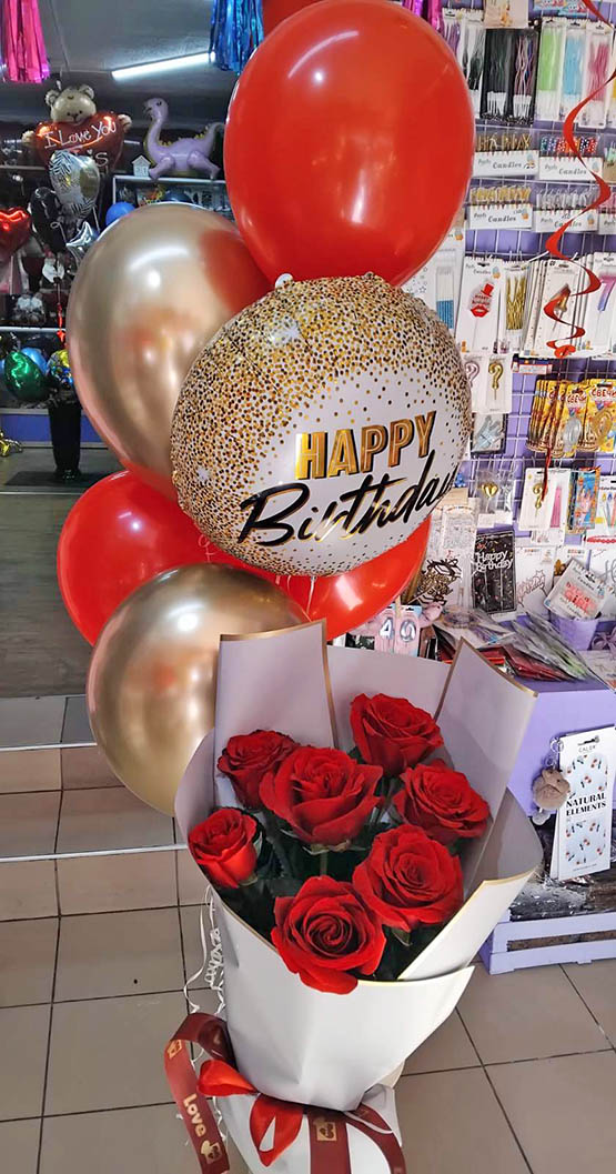 This is arrangement - combination of gel latex ballons and a large foil hearts. Colors are red and golden.