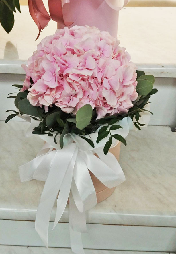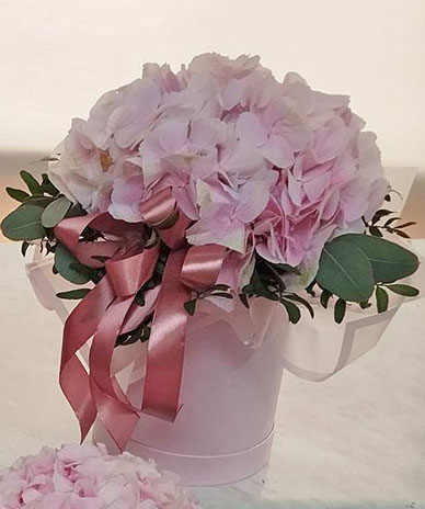 A cute and elegant box arrangement of pink hydrangea and a decorative greenery.
