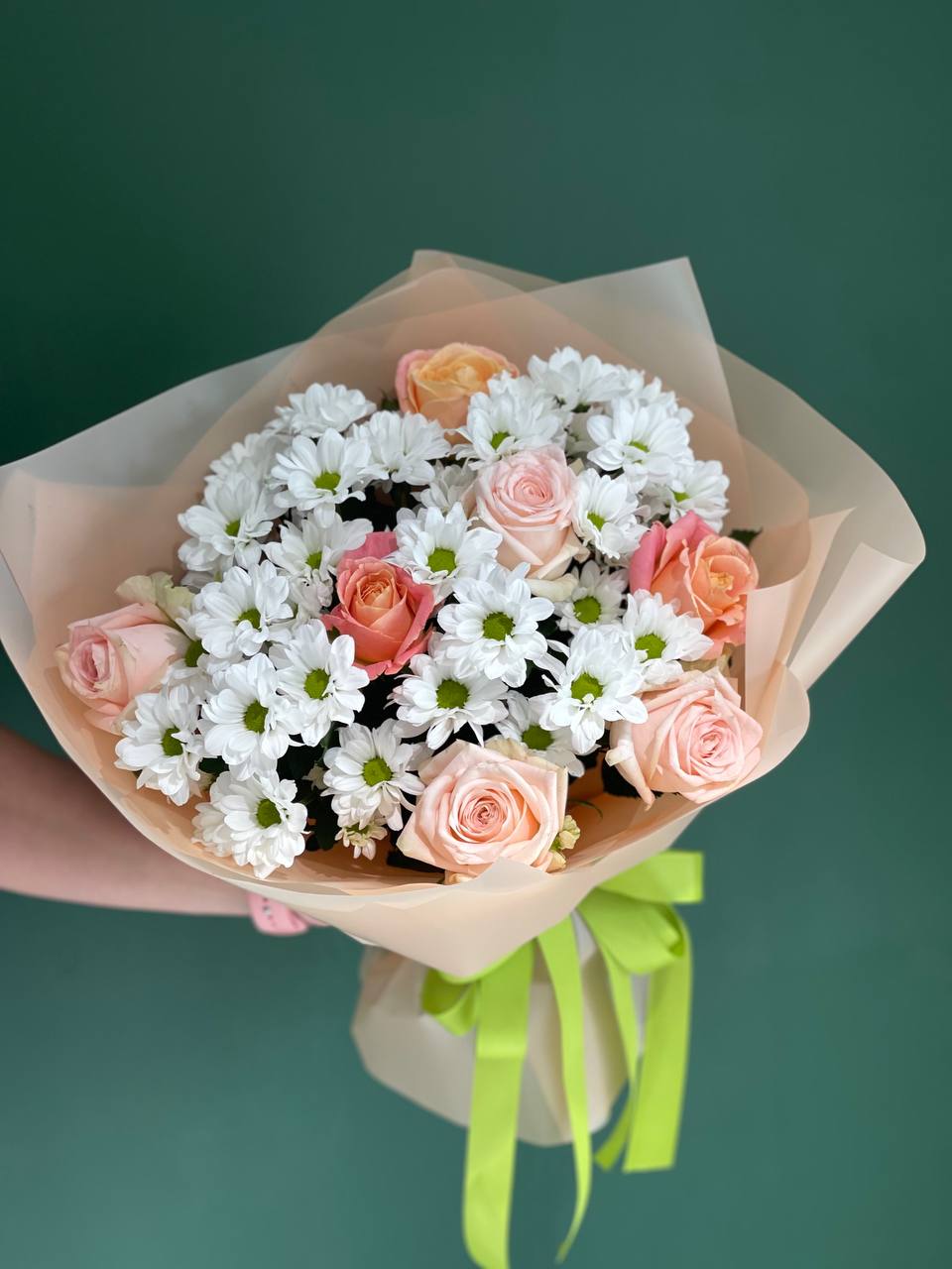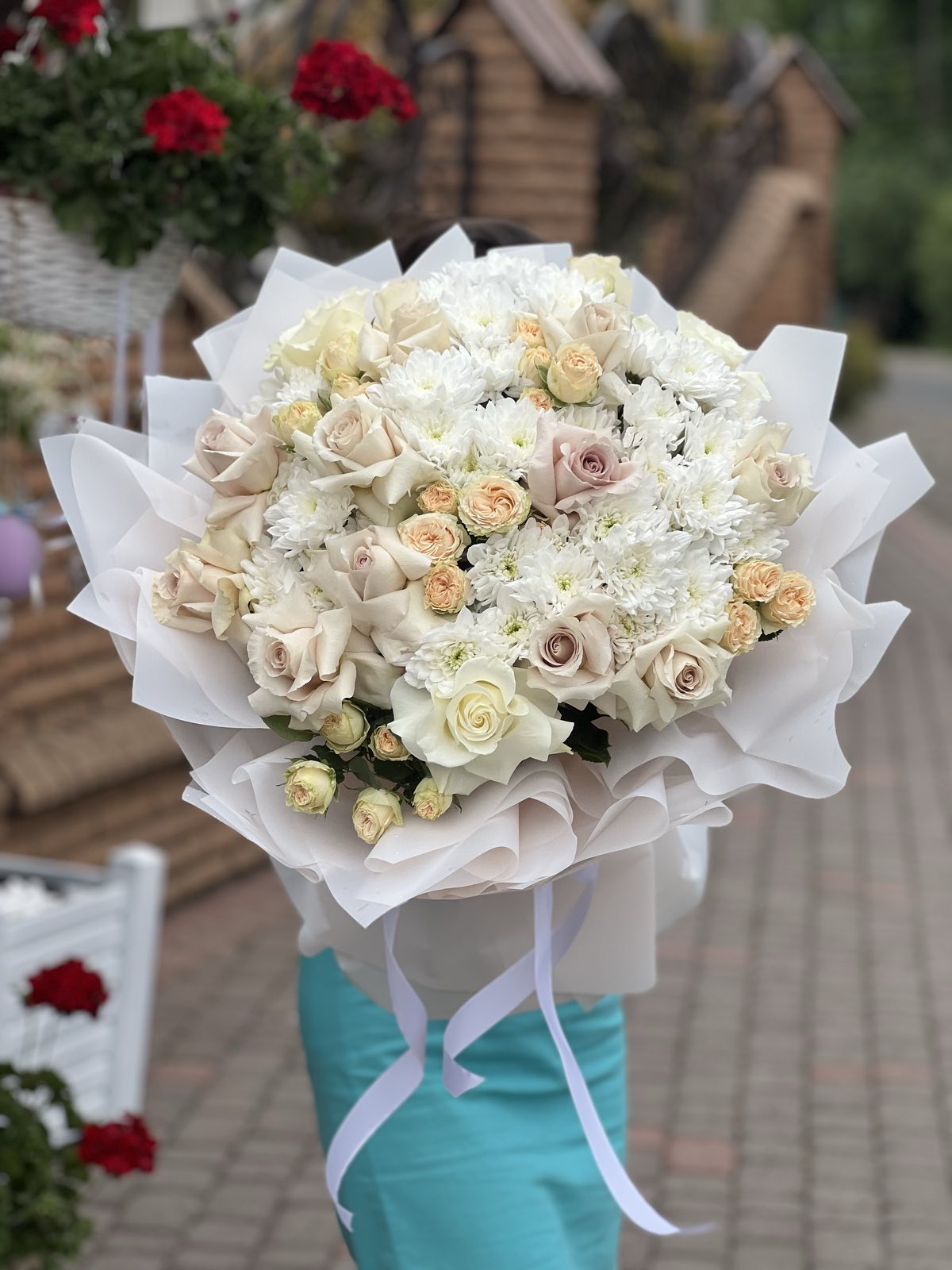 Just white and pink colors: roses, alstromerias, chrysanthemums....