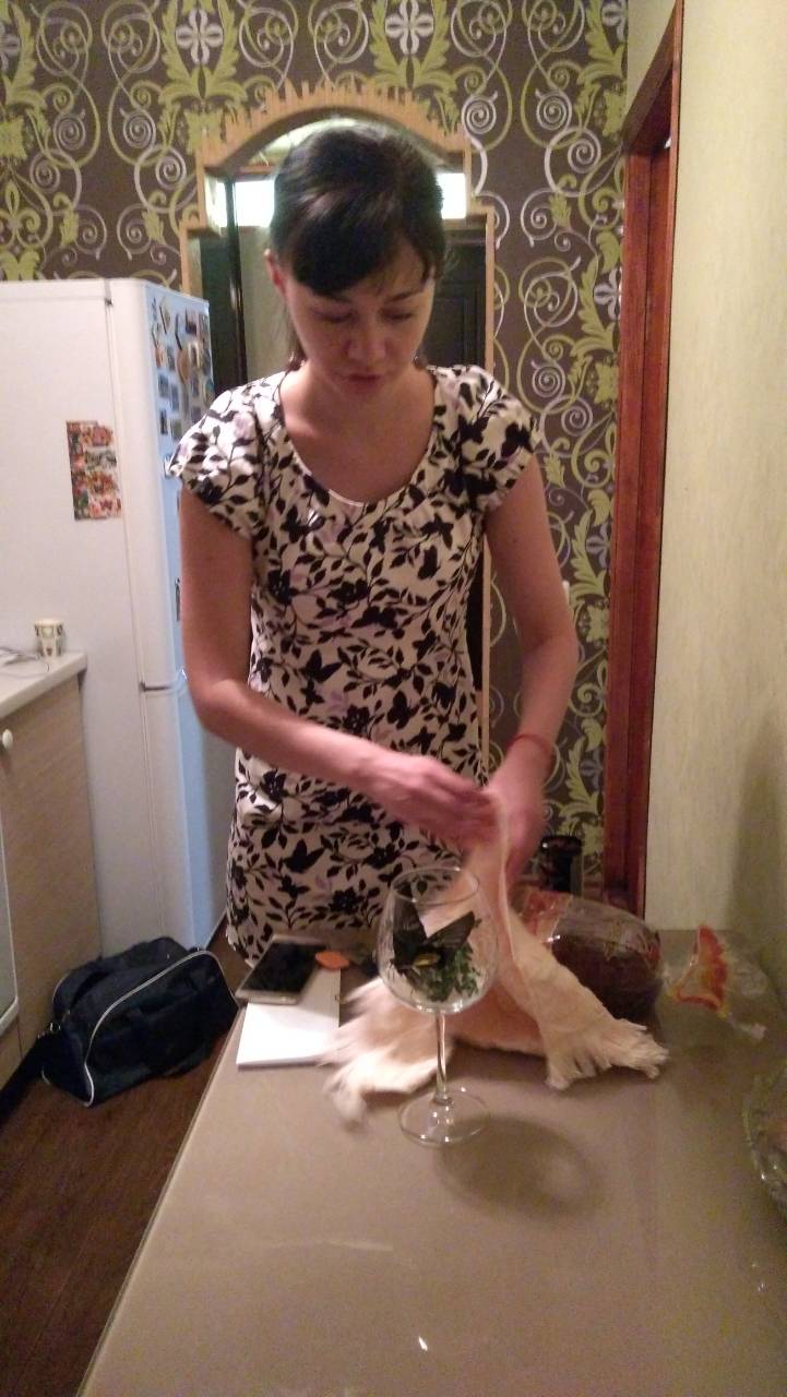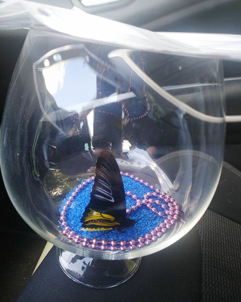 This tender creature can be presented in a big sparkling glassy goblet 25X35 size. The wing spread of our fanciful colored beauty is up to 10 centimeters. If you treat them right butterflies can bring joy to their host for two weeks at least. The most you have to do is to feed them once a day.
