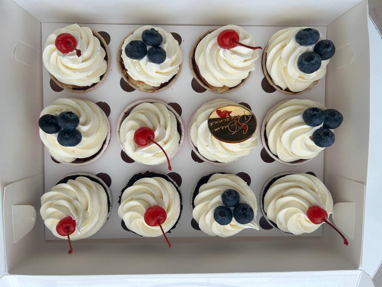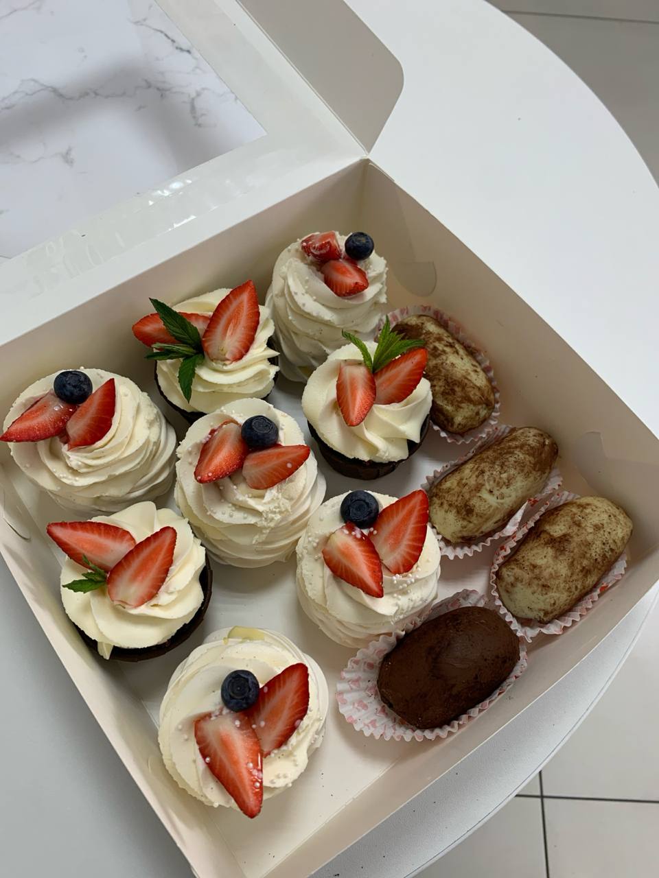 A box with 12 assorted mini cakes, 80-100 grams each.
