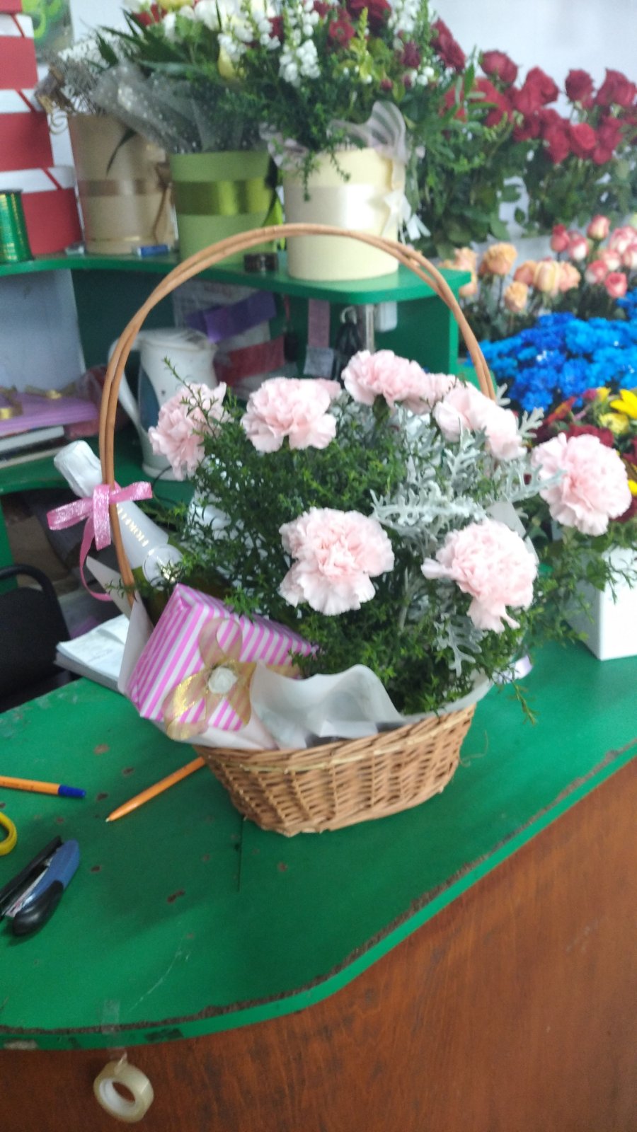 The shape of the basket may not match the one in our photo, but we will choose the most suitable one for this arrangement from those that are currently available in our store.