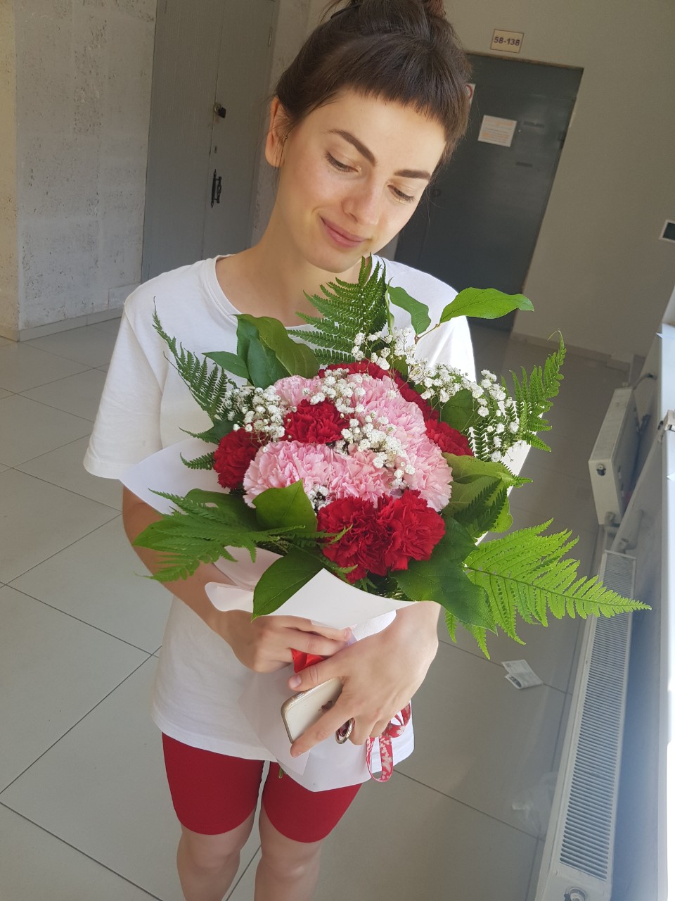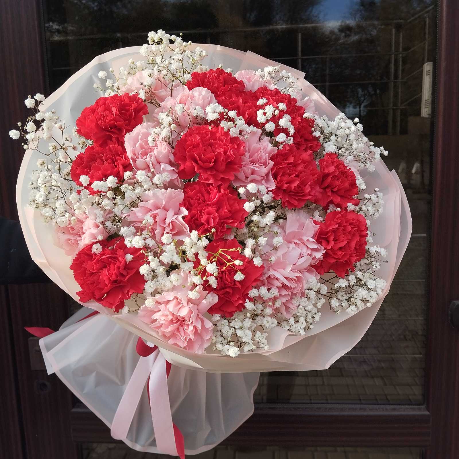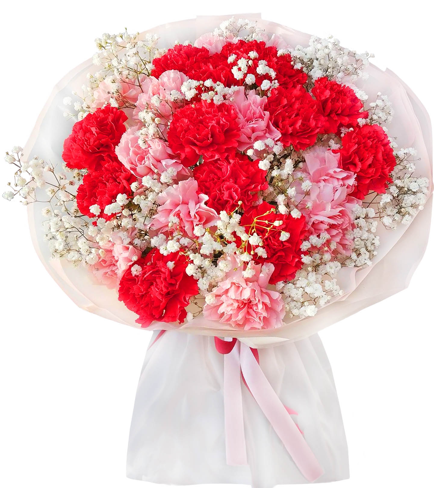 Mix of fresh large red and pink carnations with white gypsophila flowers look so elegant and festively.