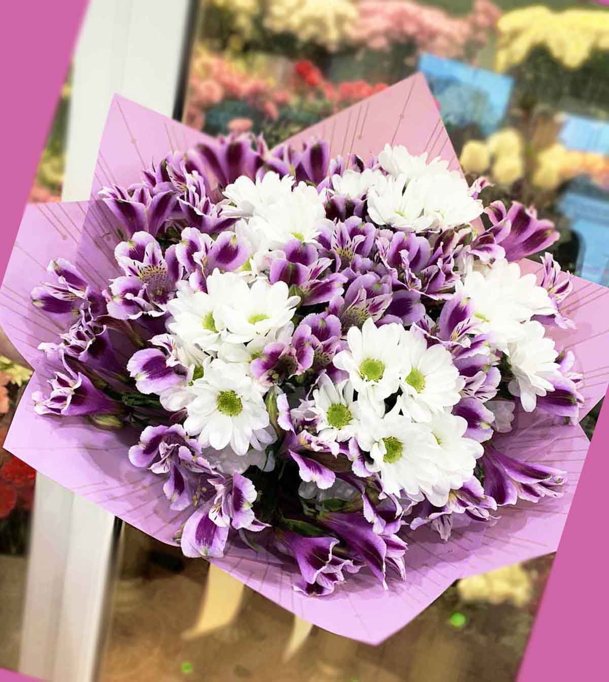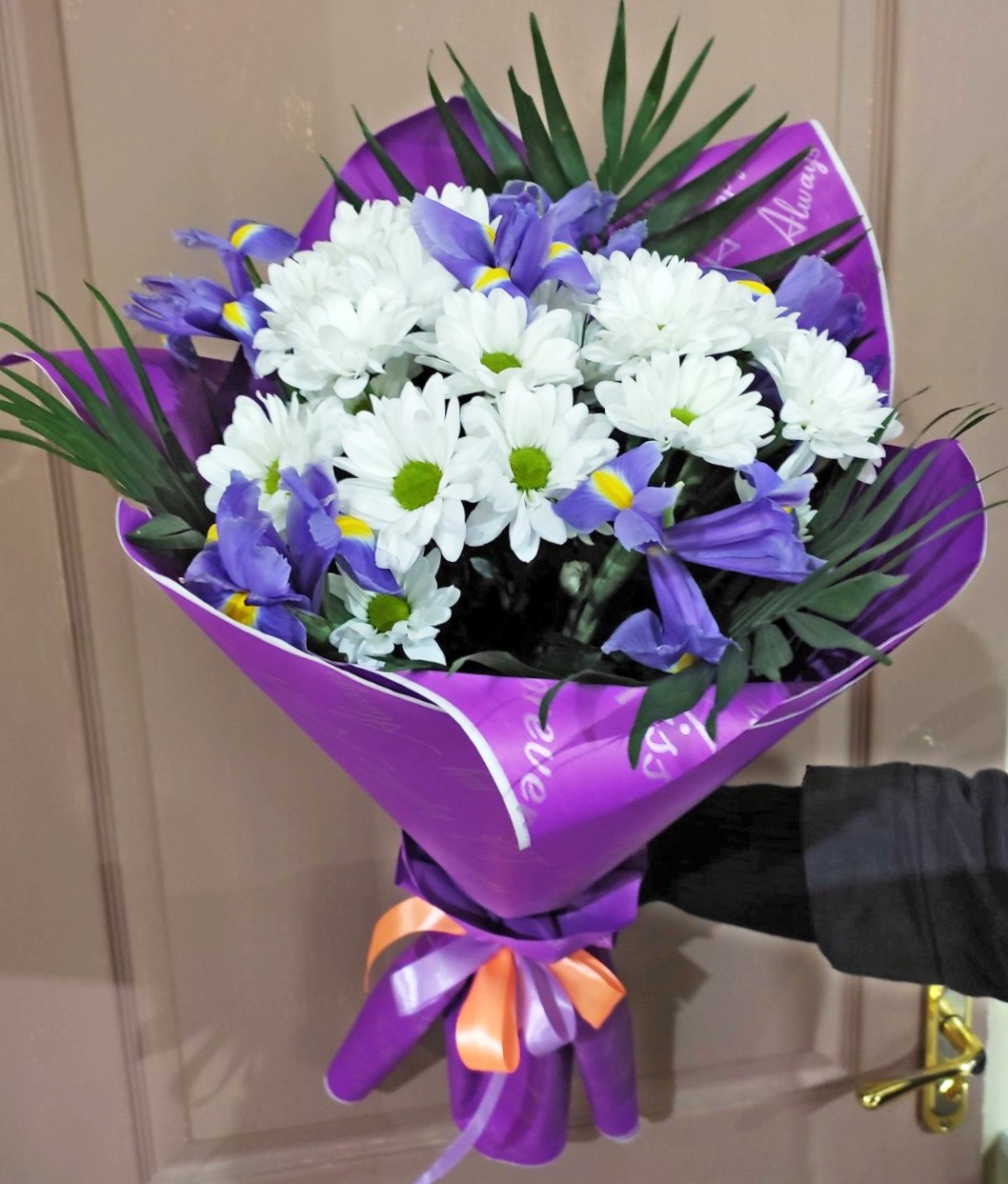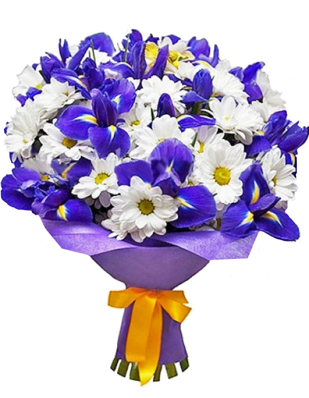 Fresh and tender looking bouquet of so loved by our local women white chrysanthemums-camomilies surrounding a blue color flowers... It can be either irises in a spring season like it is sjown at our photo, or blue eustoma, or... other blue or dark blue flowers that are available at the moment.