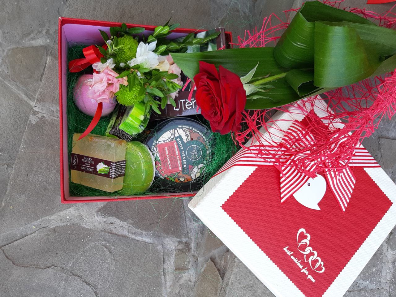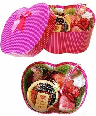 A magnificent handmade cosmetic gift set with nice decoration in a gift box with a bow.