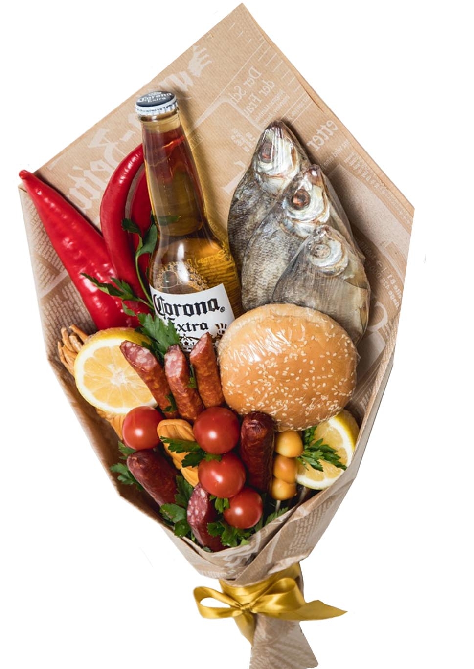3 fish, cheese, sausage, pepper, lemon, beer.
