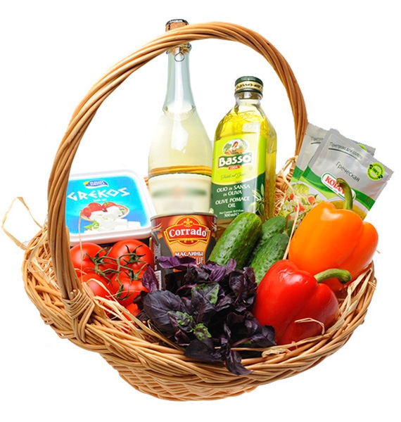 All the ingredients are tenderly set int oa wicker basket , packed into a transparent overwrap and decorated with a big bow.
