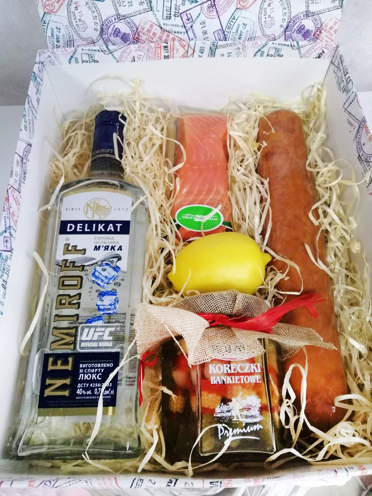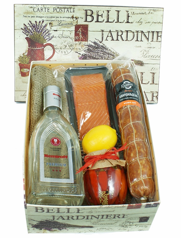 1 х bottle of Vodka Nemiroff Premium, 0.7 L 1 х sausage boiled-smoked, 500 gr. Salmon 200-250 gr 1 x lemon 1 x jar of pickled pepper or cucumber or tomatoes