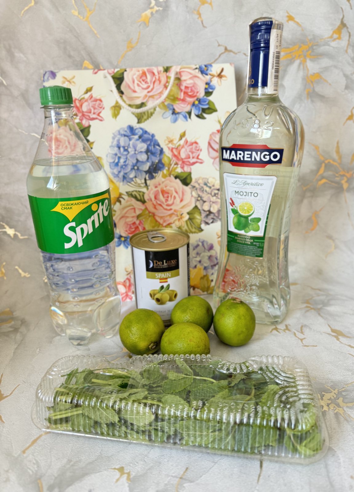 3 x Lime 1L x Marengo Mojito Vermouth 1L x Sprite, 1 x Olives can Mint...
