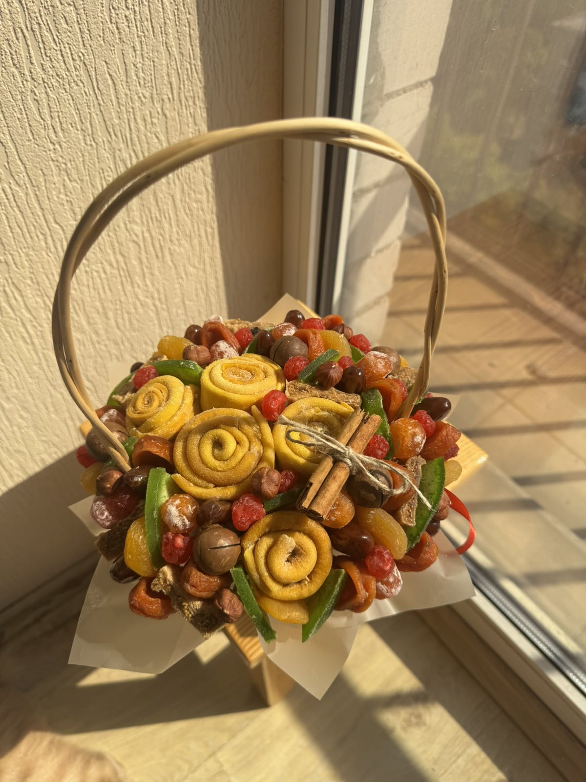 A lovely basket full of bright, beautiful flowers that are hand made of a dried fruits. Healthy, sweet, a really decent gift for a woman, child, a man!