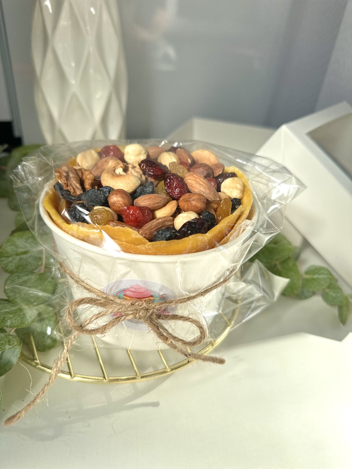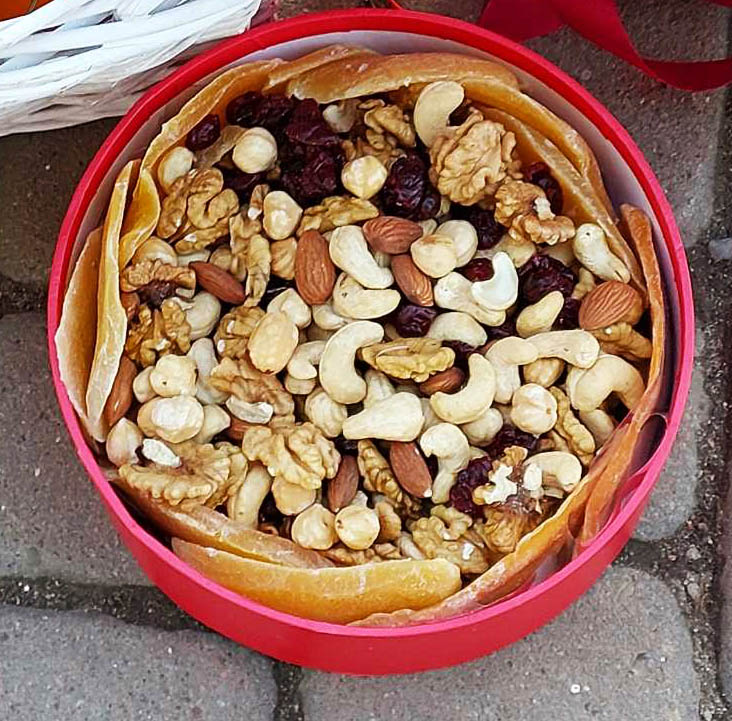 The set of mixed nuts, raisins and Mango candied fruits. They are placed into a Gift box and make a nicely arranged gift.
