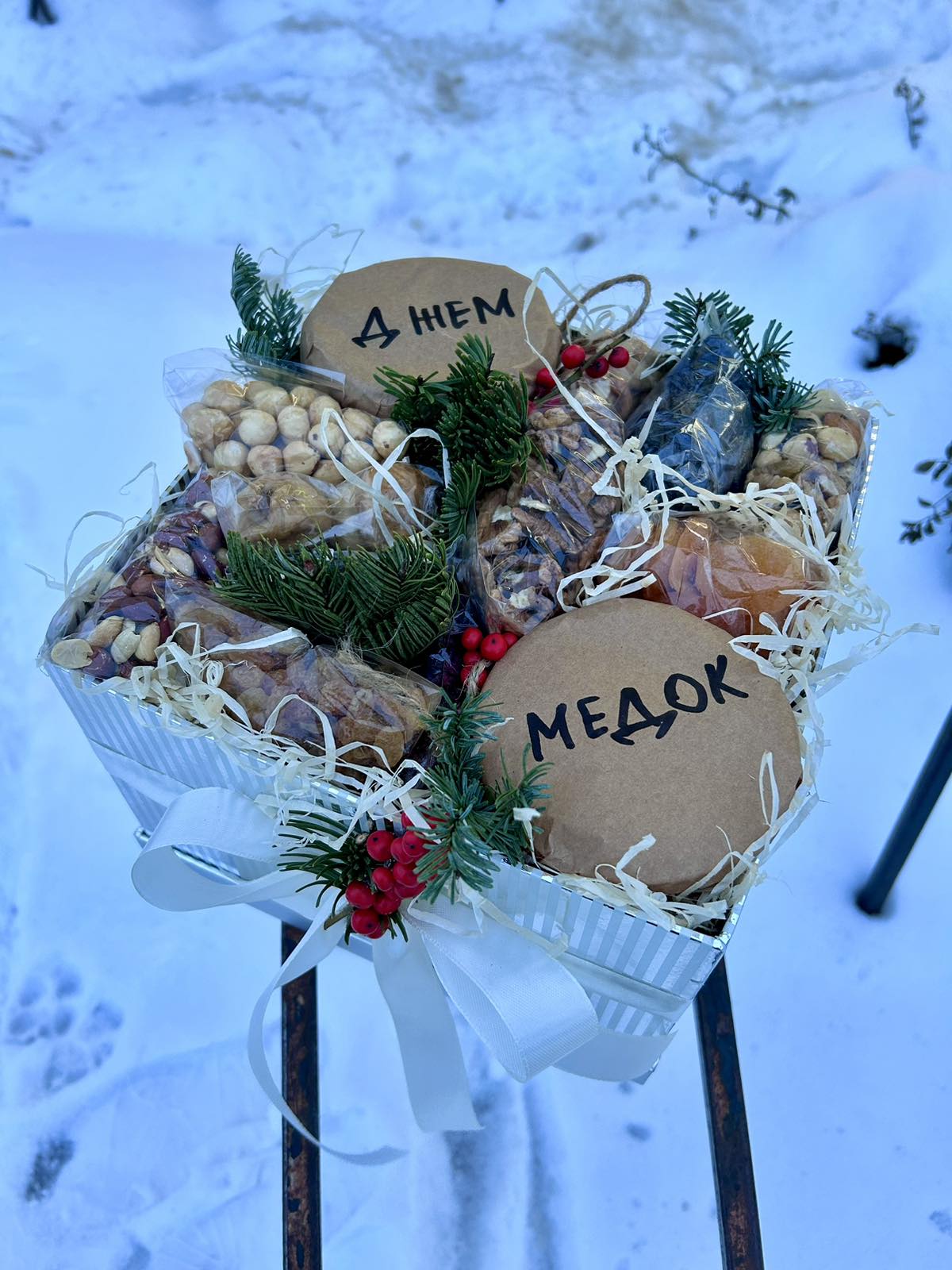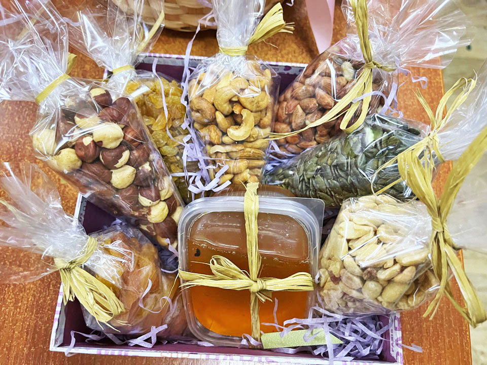 We offer 2 sizes of the Dried Fruits & Nuts accorted with a Jar of natural Honey. All the ingredients will be packed into a gift box. It's shape and color can be different of the one that is shown at our photo and depends on the boxes choice at our flower shop at the moment.