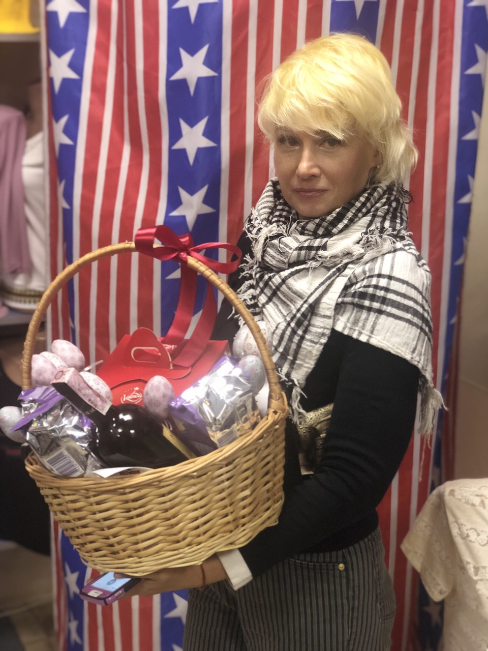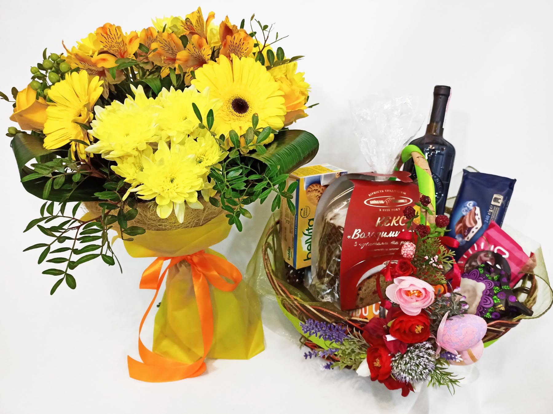 Easter cake 400-500 gr Wine Kagor, 0,7 l Cookies, 3 pieces Chocolates, 2 pieces, 200-250 gr each, Painted easter eggs, 3 pieces Easter souvenir, 1 piece A candle for the Ester cake, 1 piece All items will be presented at the traditional Easter basket