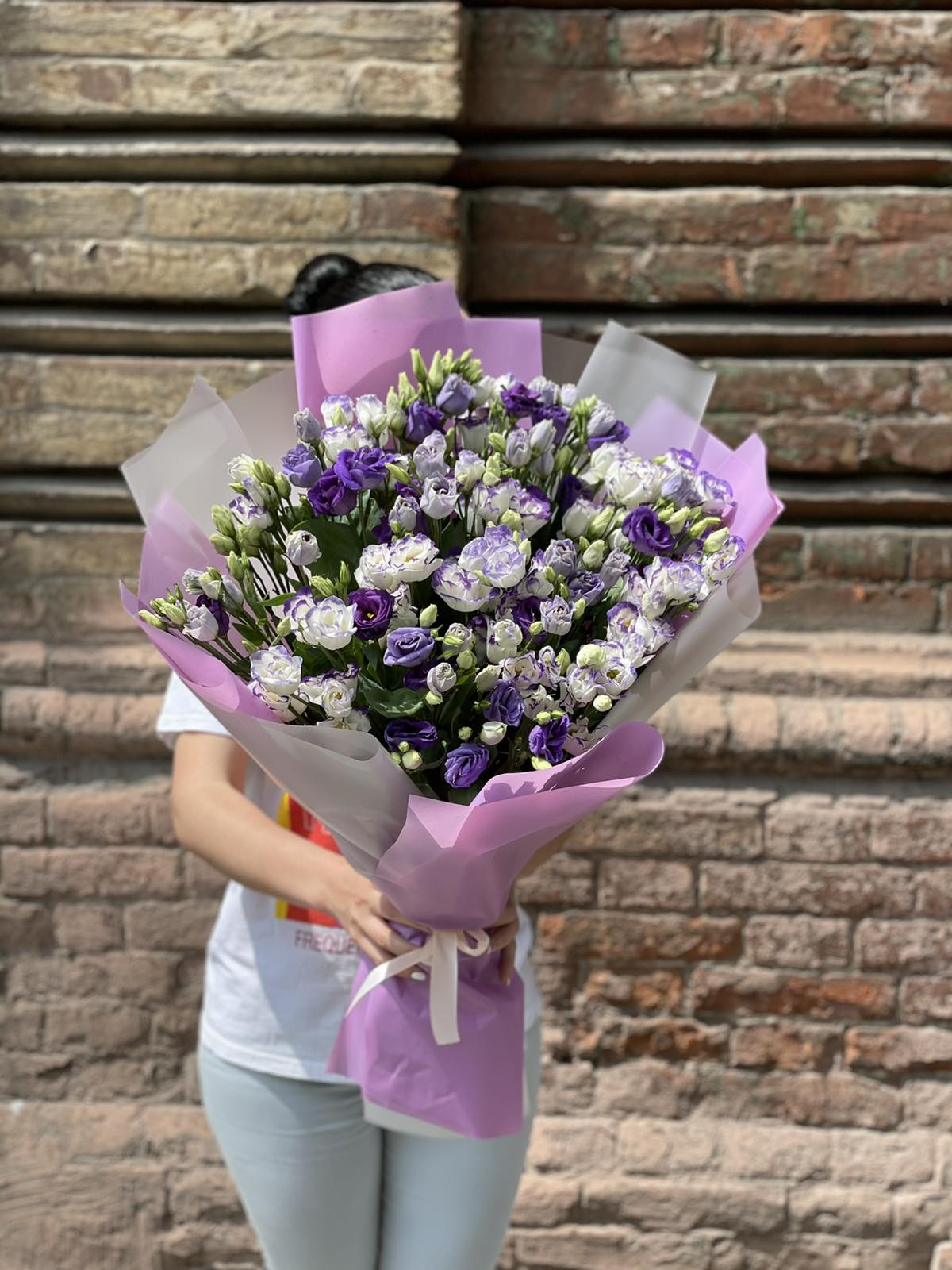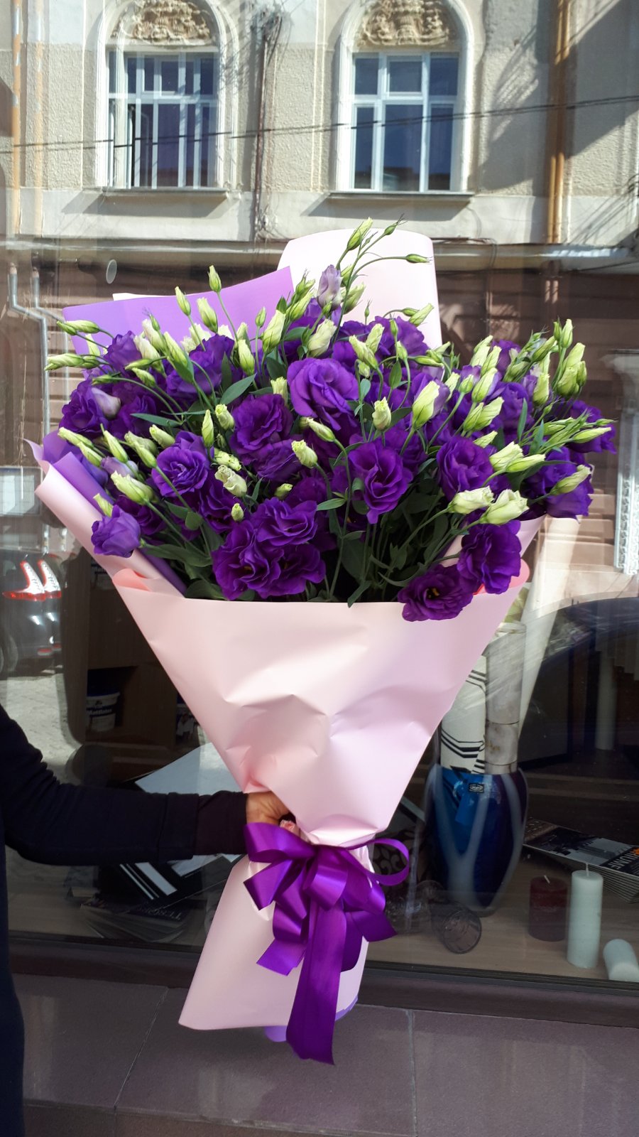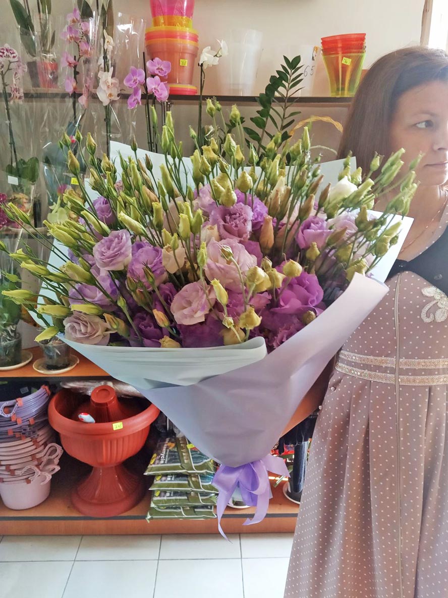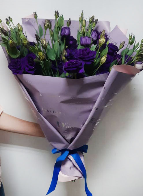 Blue or purple eustoma looks luxurious, impressing us with its deep purple-blue color and splendor. There are only 11 branches in the bouquet at our photo , but there are much more flowers, because each branch diverges into several smaller ones and has 3-4 flowers at ech branch, as well as a few buds. Such bouquet might stay fresh a week with a proper care!