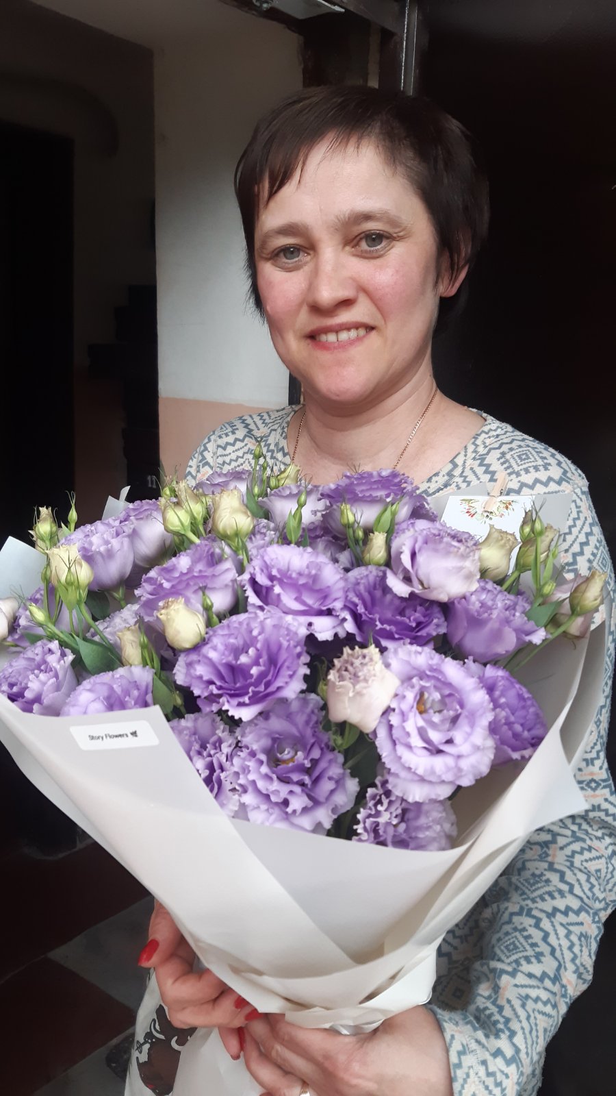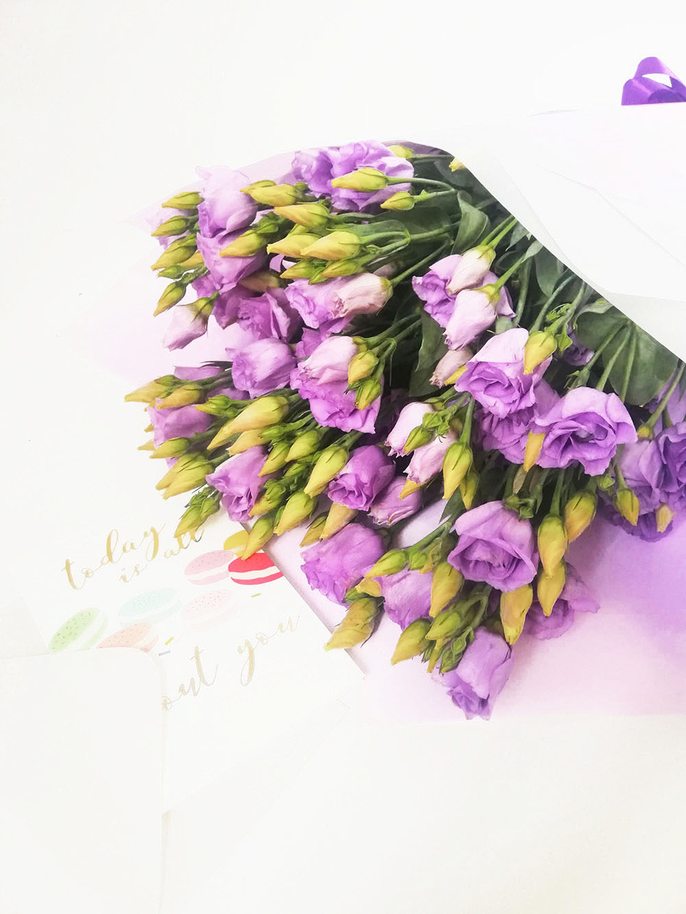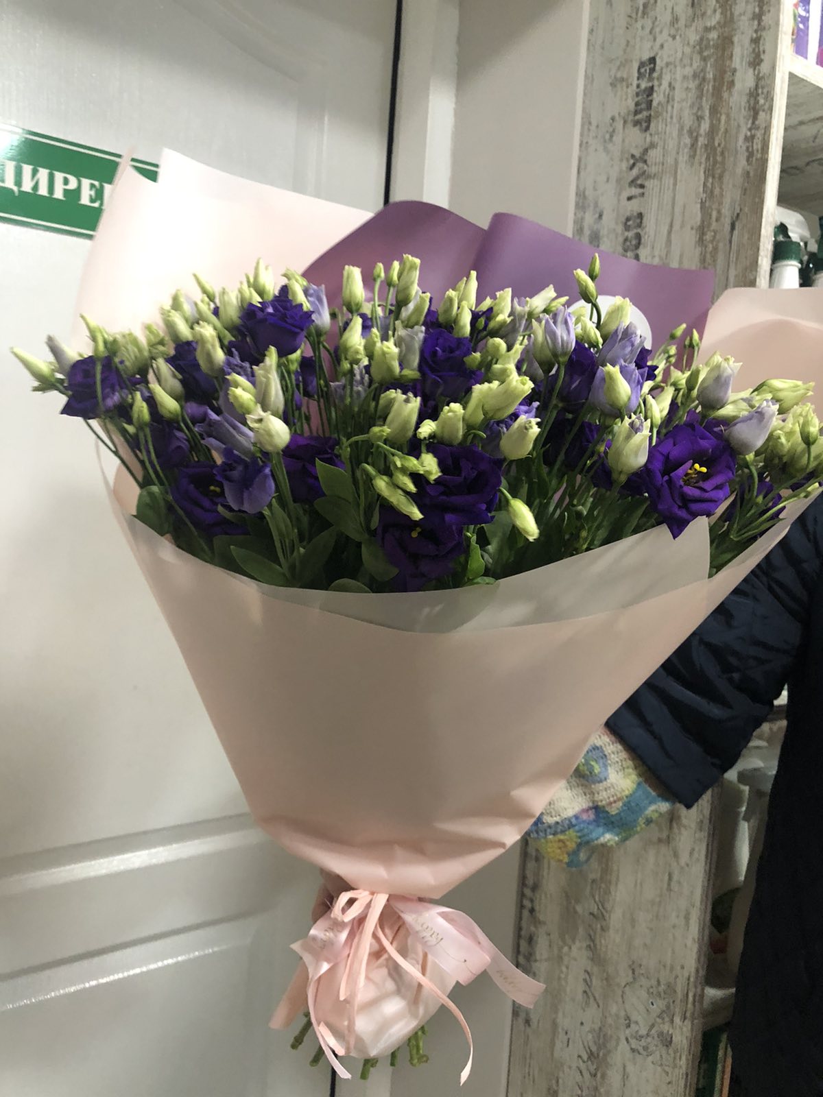 Blue or purple eustoma looks luxurious, impressing us with its deep purple-blue color and splendor. There are only 11 branches in the bouquet at our photo , but there are much more flowers, because each branch diverges into several smaller ones and has 3-4 flowers at ech branch, as well as a few buds. Such bouquet might stay fresh a week with a proper care!
