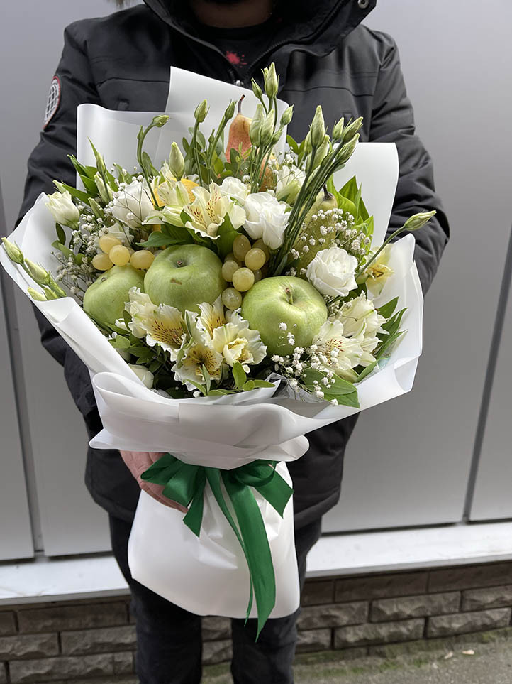 3 x Stems of Eustoma 5 x Alstroemerias 3 x Green apples 1 x Lemon 2 x Pears graps