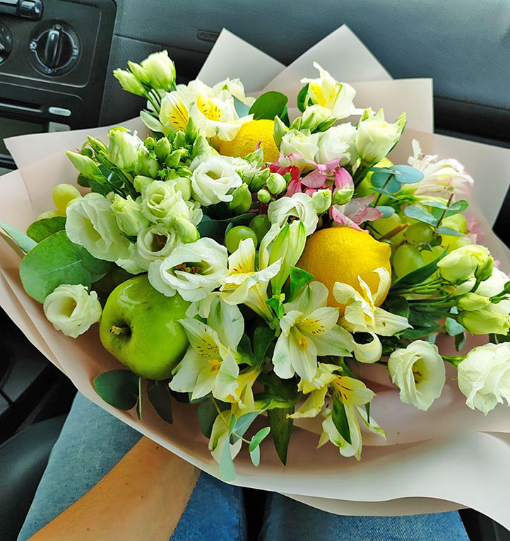 A new trend in floral design - bouquets of flowers with fruits, or citrus.