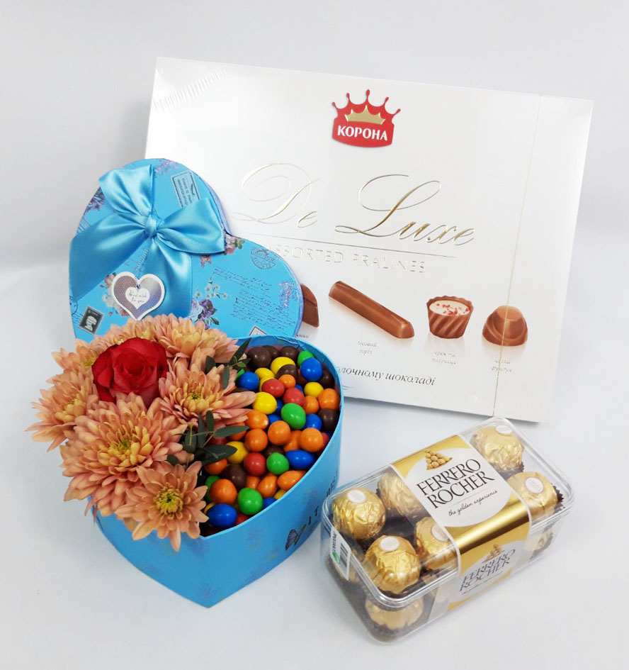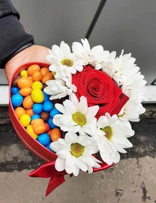 Small box with 1 red rose, white chrysanthemums flowers and 300 gramms of M&M chocolate dragee. The box size is 14-16 cm., wide and long like on our main photo.