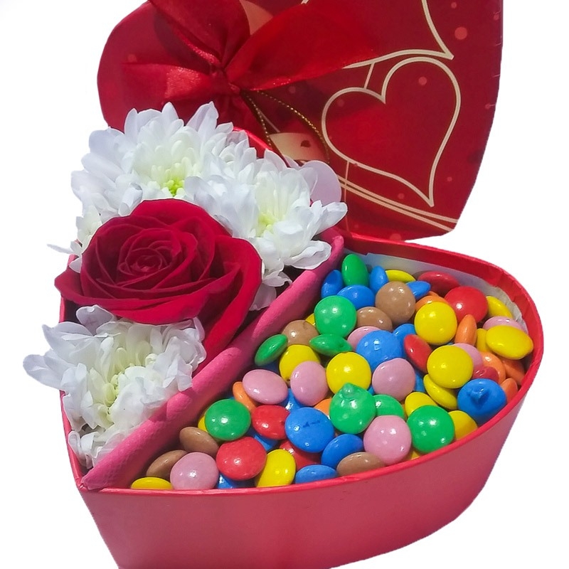A bright and merry Gift box with red rose (s) and white chrysanthemum dasies with the second half filled with bright candy dots! Here you have green, yellow, blue, red, brown chocolate dragees bringing the atmosphere of a holiday!