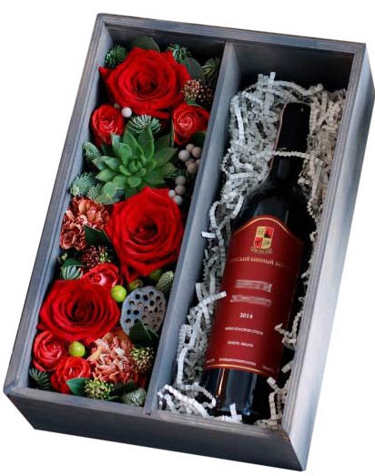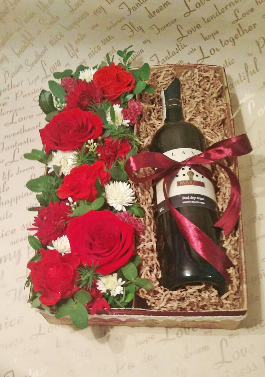 A gift box with a bottle of red wine and red roses. Other flowers and decor.