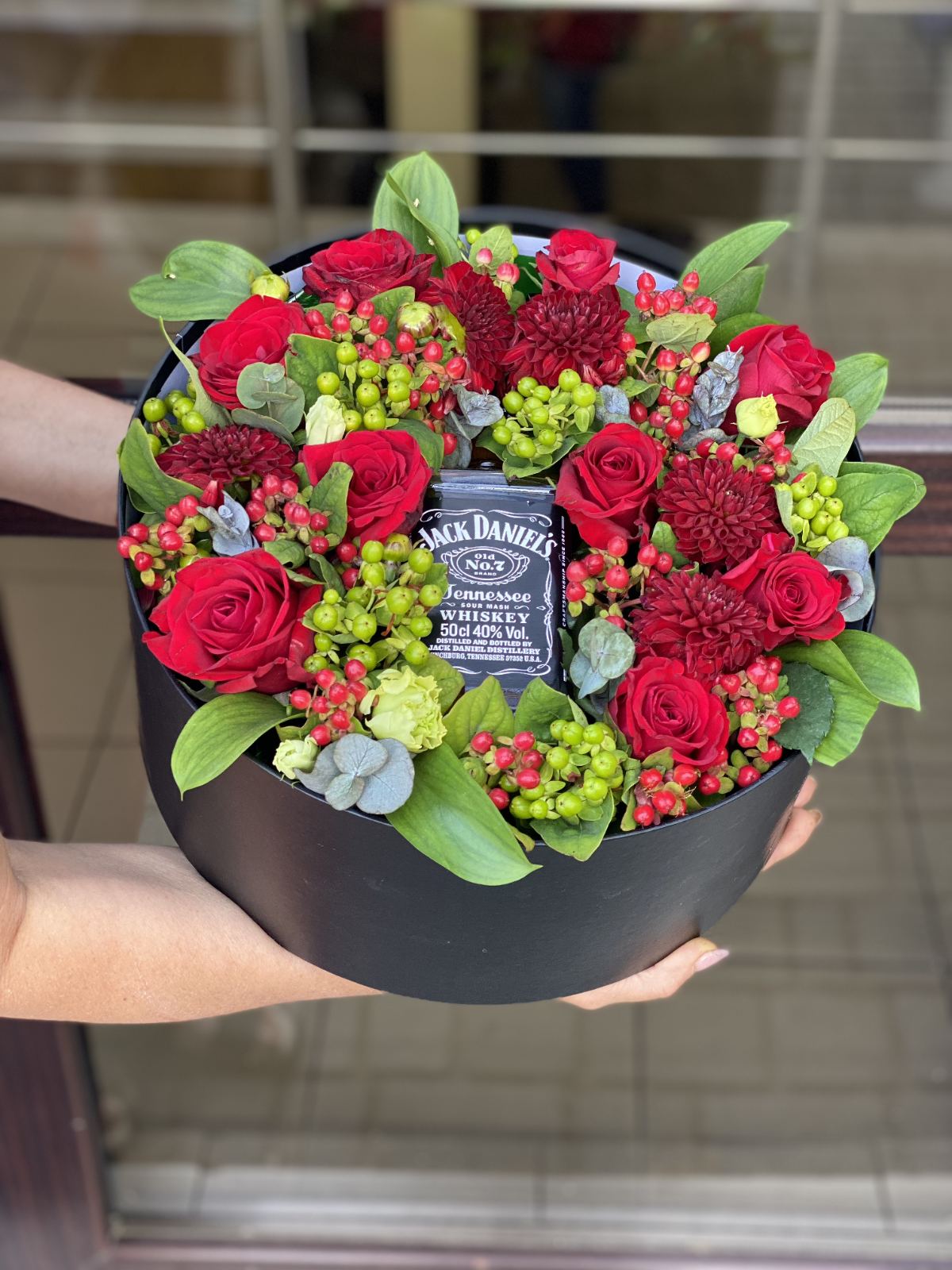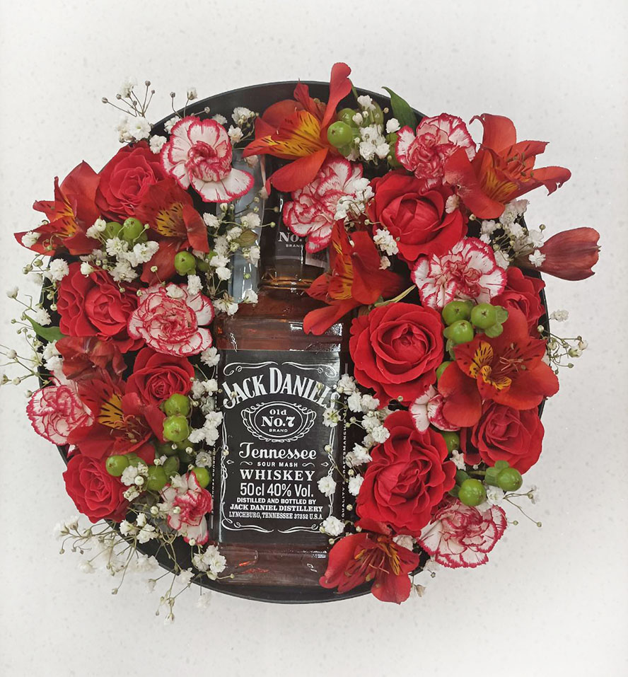 Jack Daniels among the beautiful red flowers in a gift box.