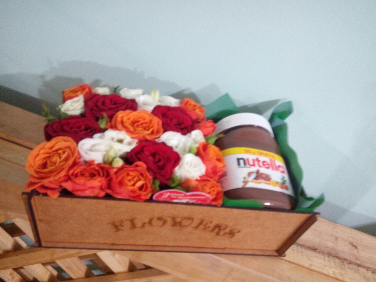 This beautiful present box ( colors may vary) is mostly filled with flower arragemnet and its less part is with a jar of yummy Nutella - Italian chocolate-nut paste. What can be more enjoyable than a crispy toast with Nutella on it!