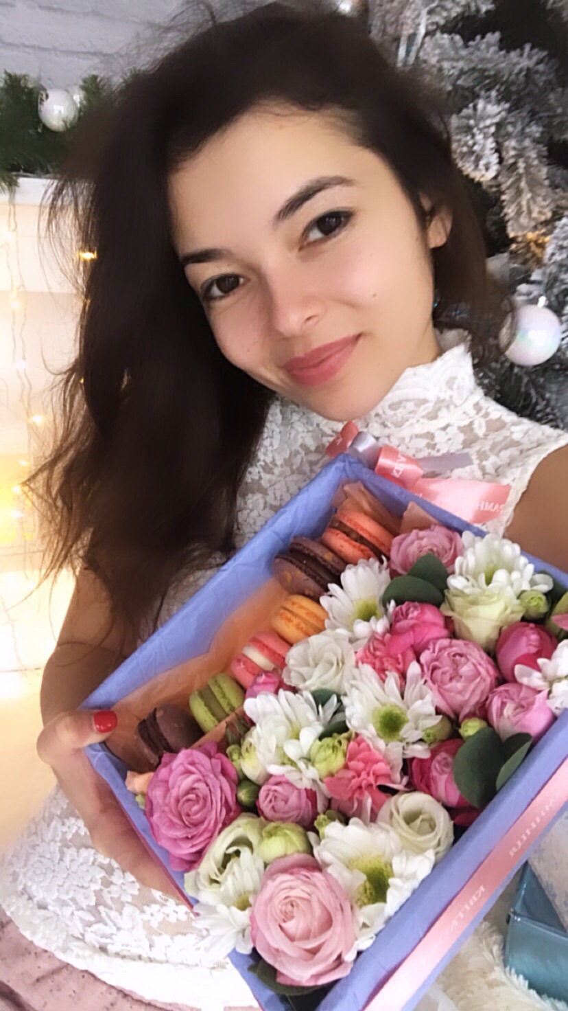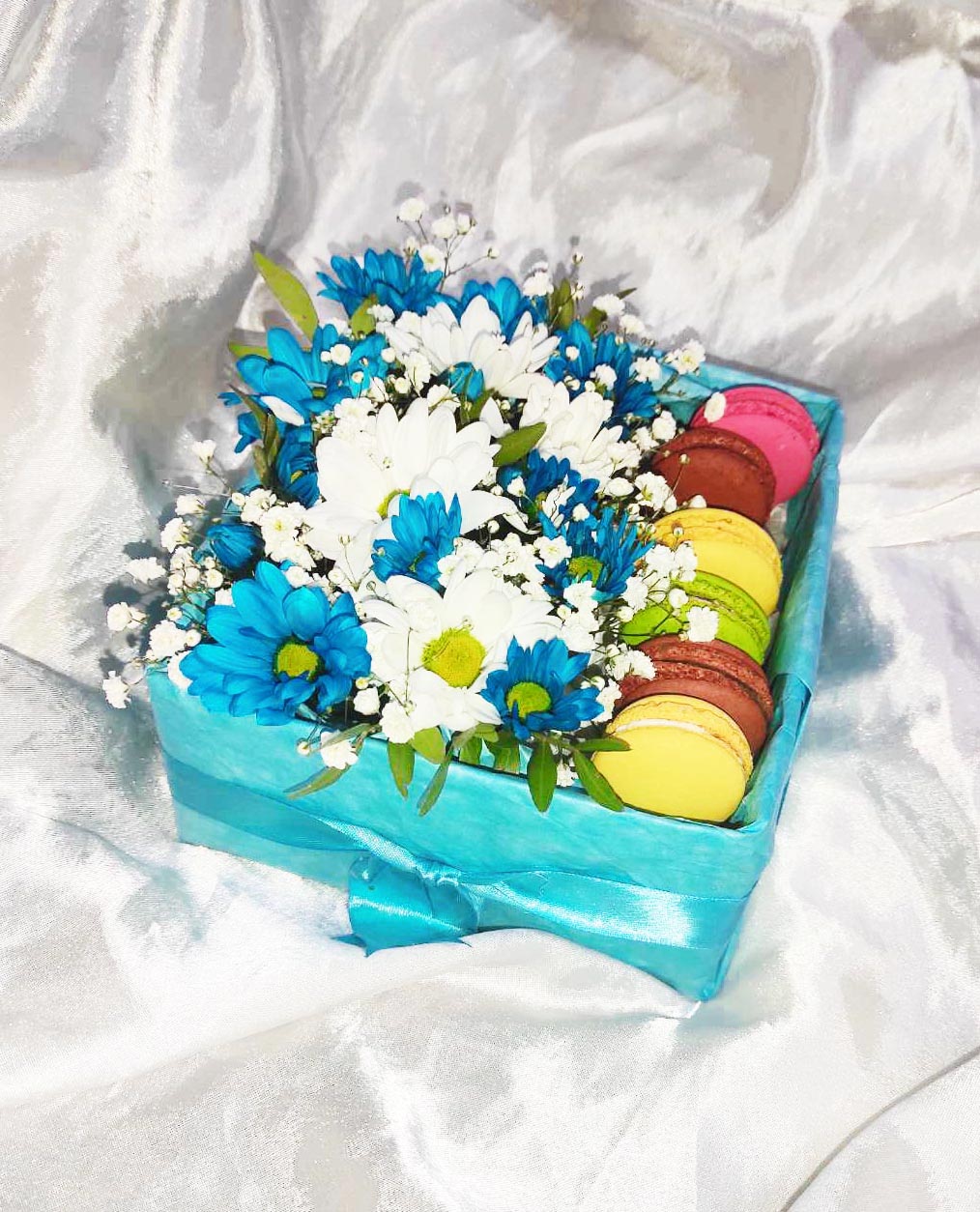 This nice gift box has flowers and incomparable makarunas - delicious French pastry.