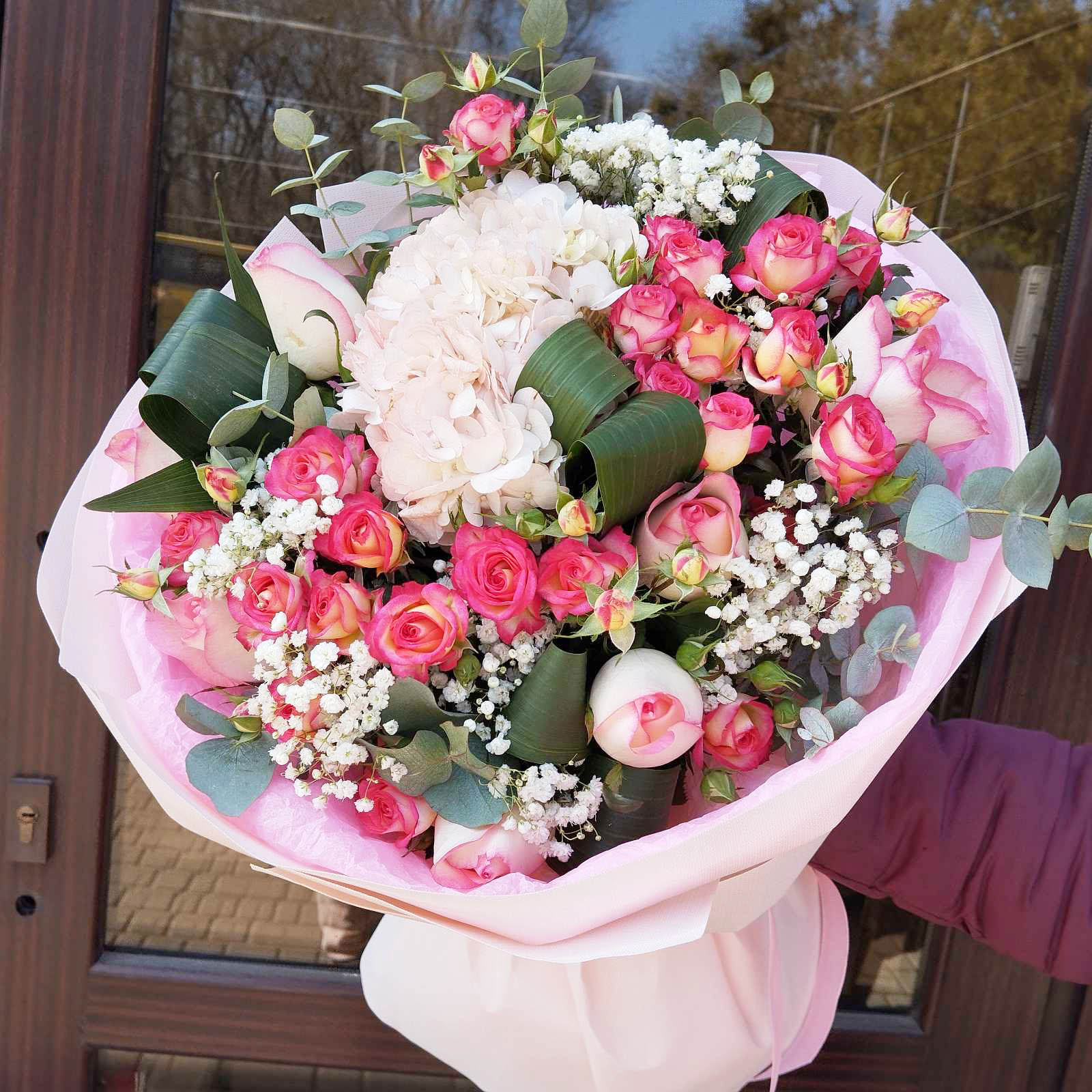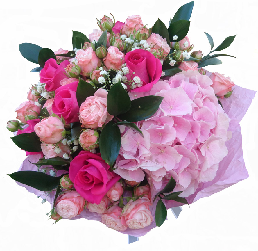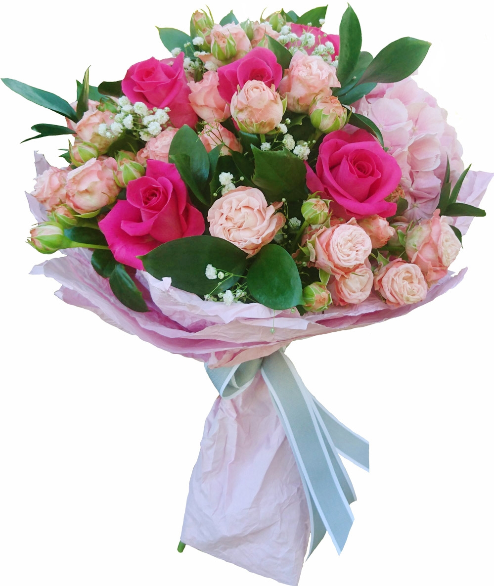 This amazingly romantic airy bouquet contains  different kinds of roses  - some big-headed hot-pink roses which  are nicely complimented with sprays of cream-apricot ones and accompanied by some greenery.