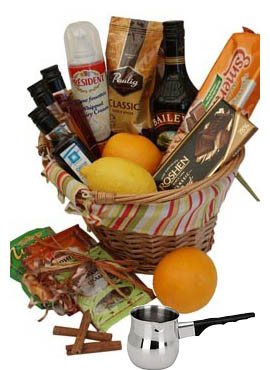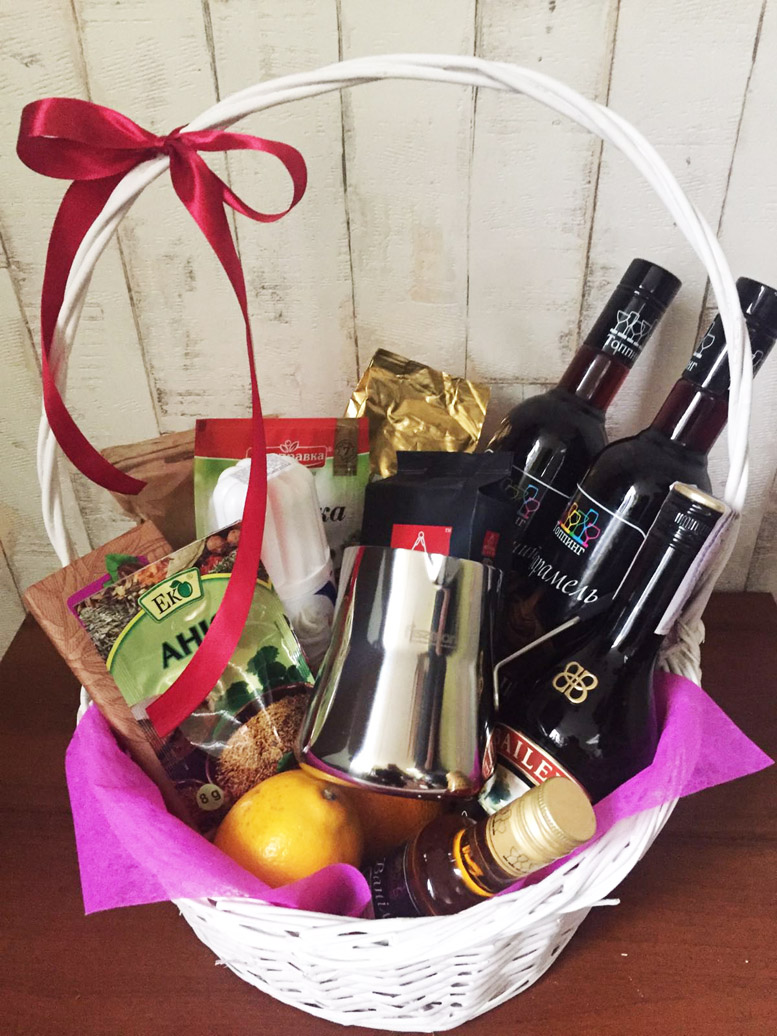 1 x Coffee beans Arabica, 250gr 1 x Ground coffee, 250 gr 1 x Bailey’s liquor; 1 x Chocolate syrup 1 x Caramel syrup 1 x Vanilla syrup 1 x Bar of dark chocolate 1 x Whipped cream 1 x Big lemon 2 x Oranges; 1 x Lemon citron 2 x Cinnamon 1 x Clove 1 x pack of anis seeds 1 x Stainless steel cezve