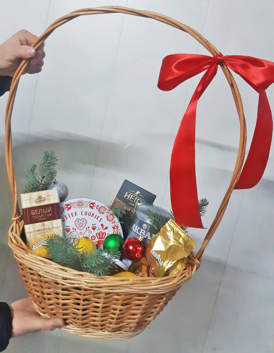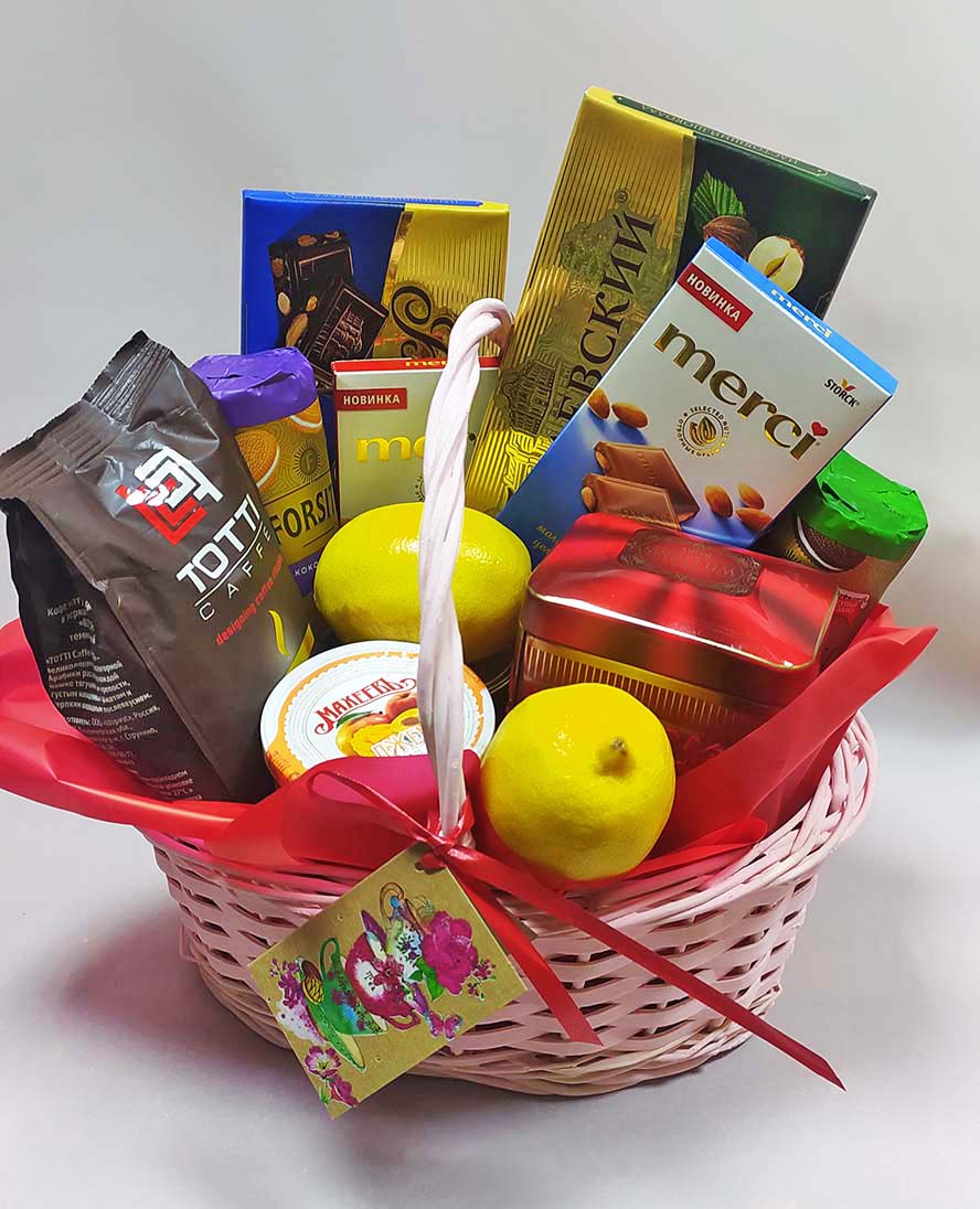 1 x Marvelous Arabica coffee beans, 250 g 1 x Can of Elite black British tea, 225 g 1 x Can of amazing imported cookies 1 x Can of Jam or marmalade 1 x Jar of natural honey 1 x Bar of black chocolate 1 x Bar of white chocolate