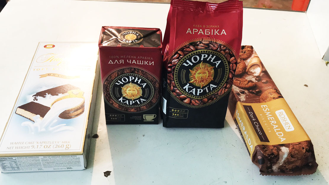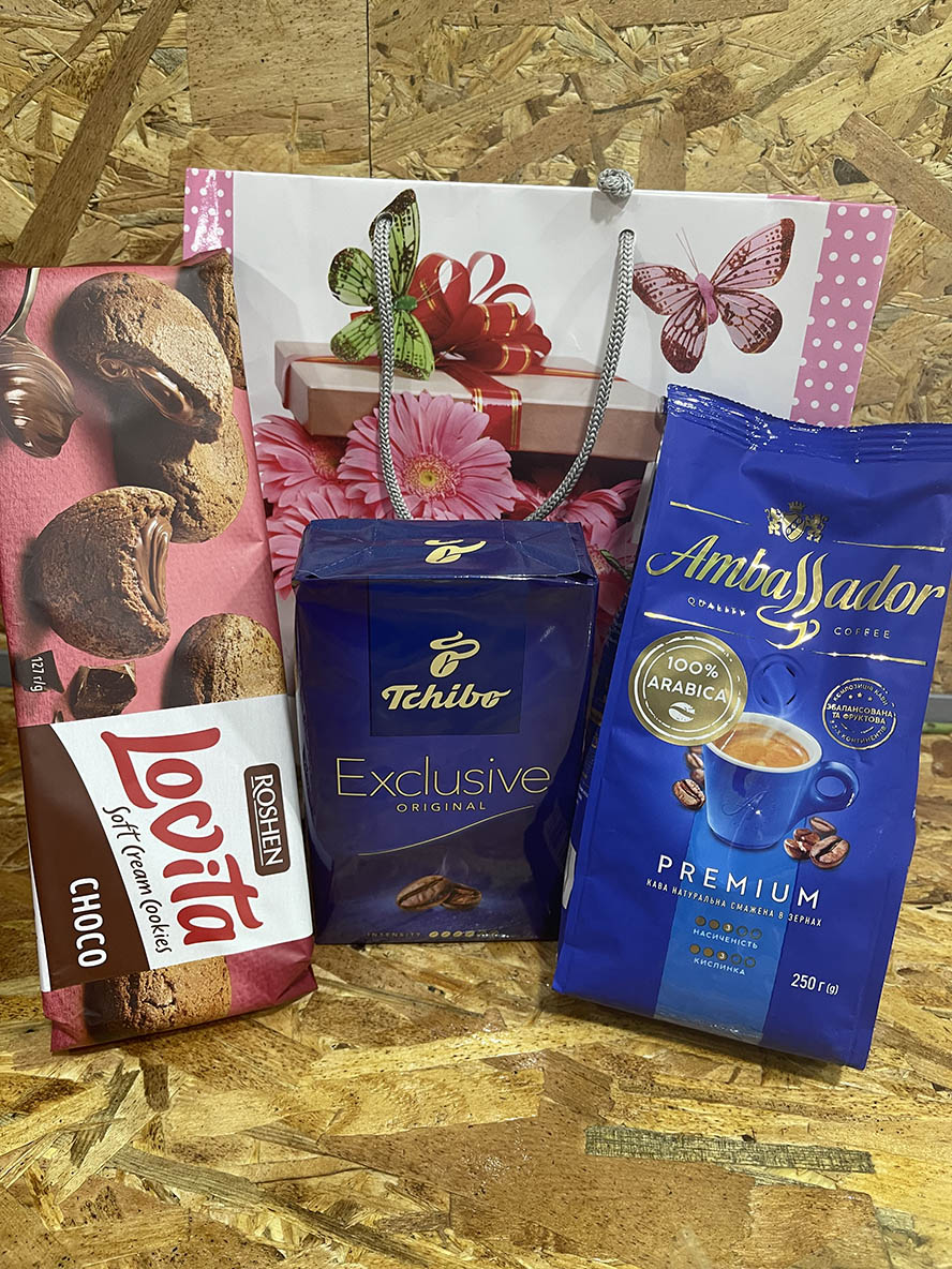 1 x Arabica coffee beans, 250 gr 1 x Ground coffee in a vacuum pack, 250 gr; 1 x Chocolate cookies (pack)