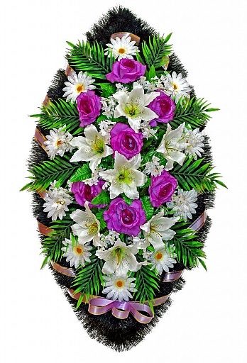Funeral ritual wreath, made mainly purple or purple and white artificial flowers.