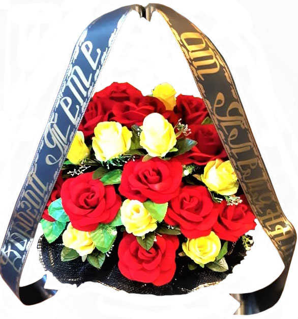 The black ot white mouring strip with a short text of condolences can be added to flowers due to Ukrainian tradition.