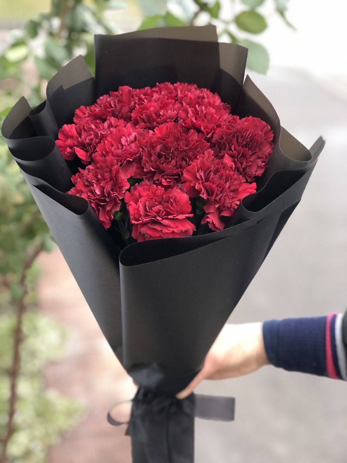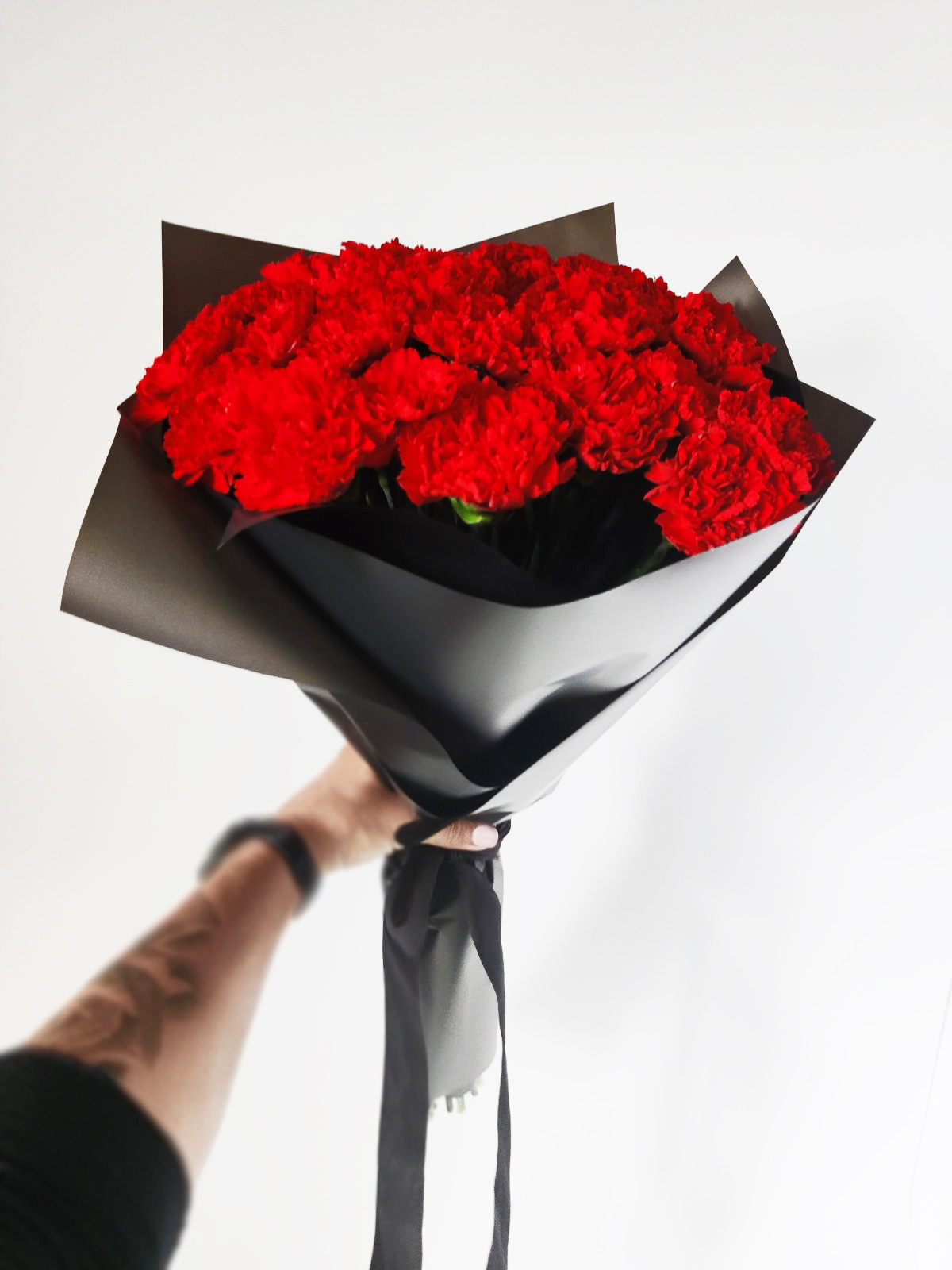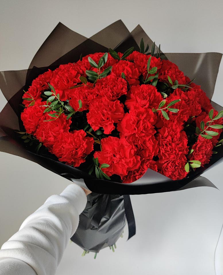 At the shown bouquet there are 44 Red Carnations, but you could choose another the amount of flowers, that you think would be the most appropriate for your particular case. The bouquet will be arranged similar to what you see at the photo, however may be a little different. Anyway, there will be the ordred amount of flowers, greenery filling and a mourning black rapping.
