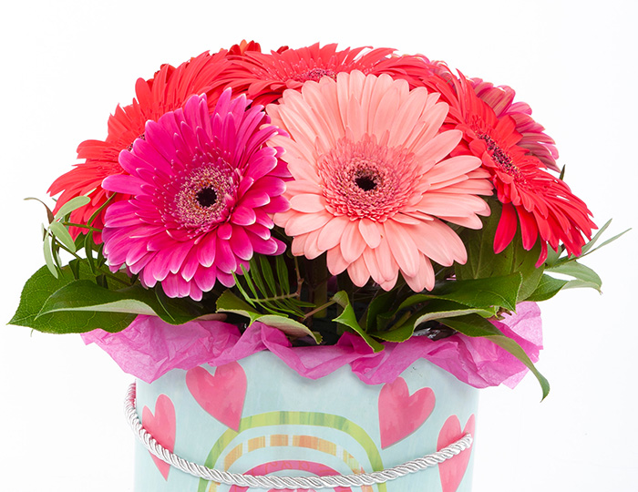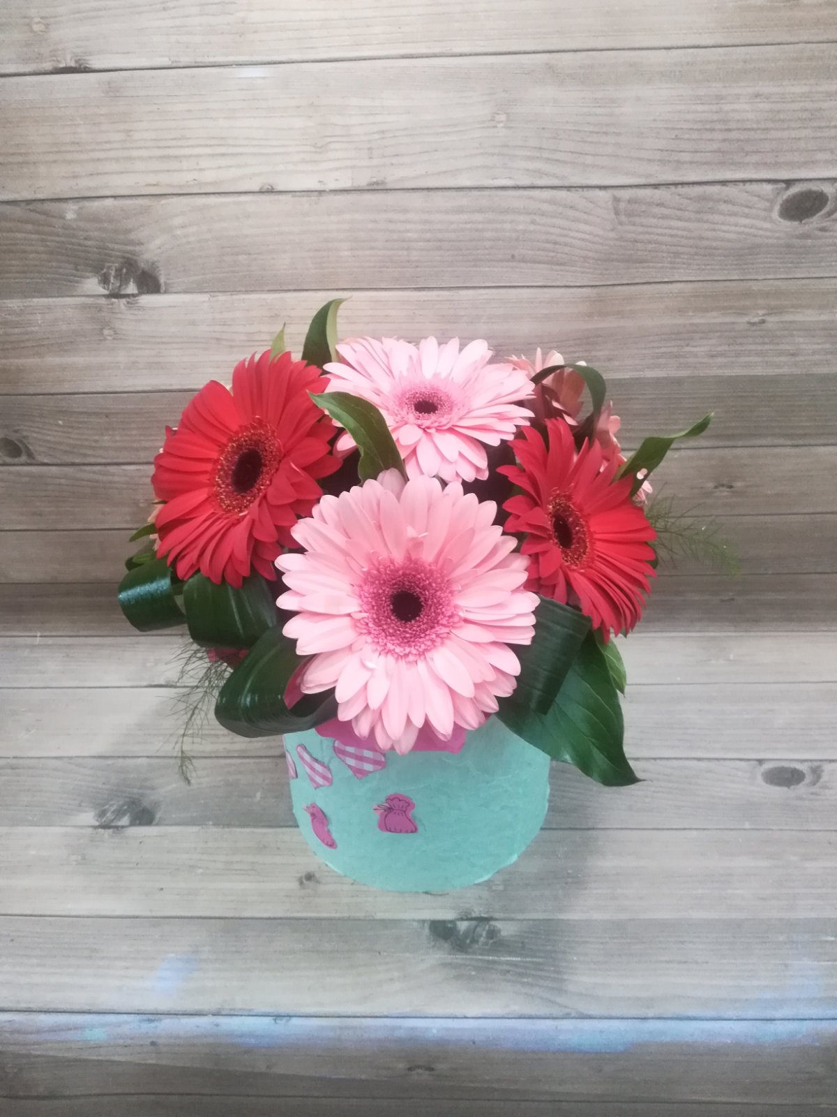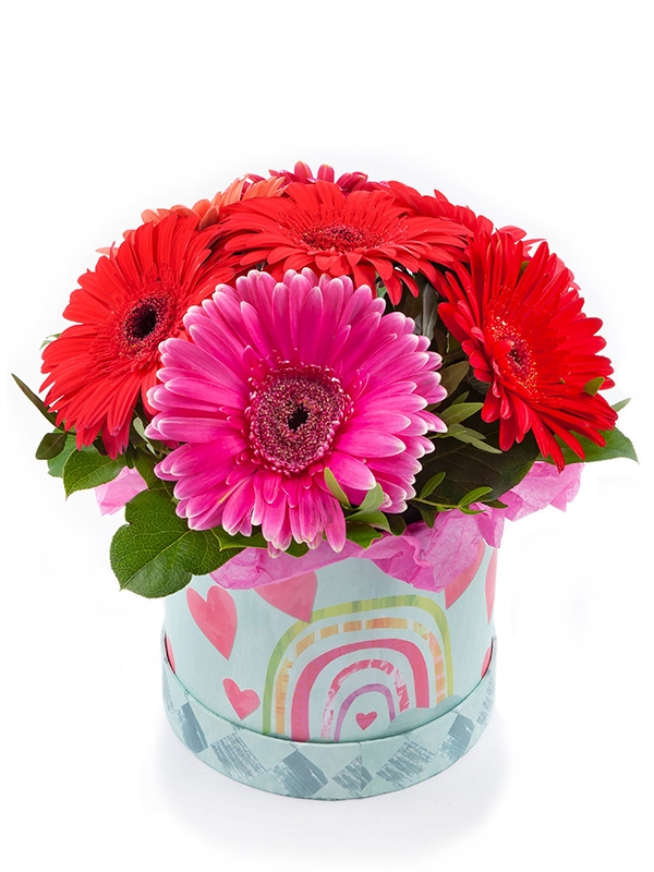 This bright gift of gerberas in pink, red and raspberry colors arrangged in a hat box will definitely cheer her up and cause a spark of passion in a girl’s heart.