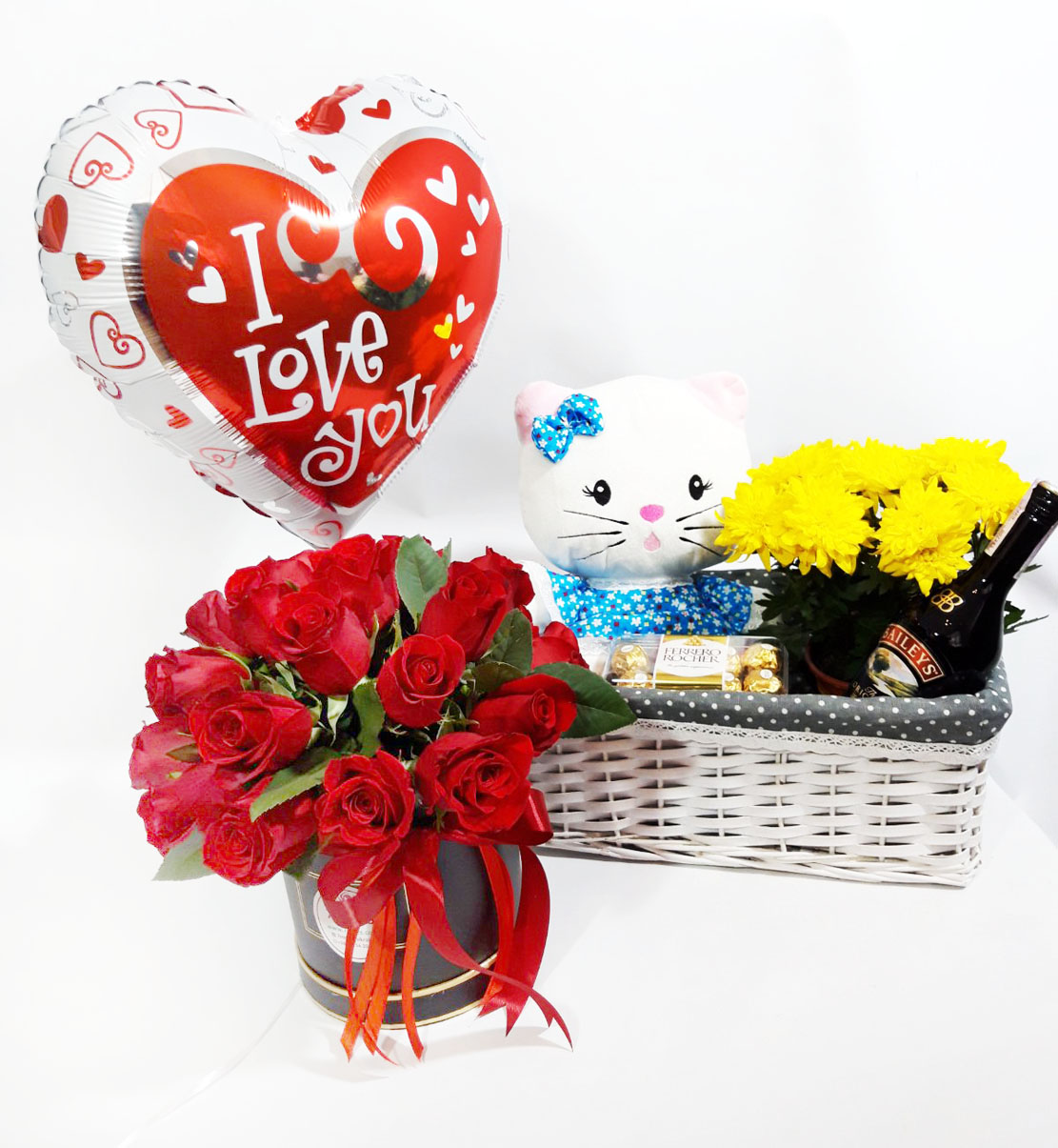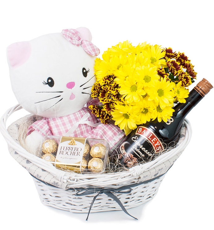 Cute toy, sweet and most tasty Bayleis liquer, quality Ferrero Rocher chocolates and warm bright flowers! It's a full set of a most desired small things for a girl, for a lady of any age. It would be a great choice to send as a Birthday gift, gift for Christmas and New Year, or with no reason but just to bring a smile to the receiver.