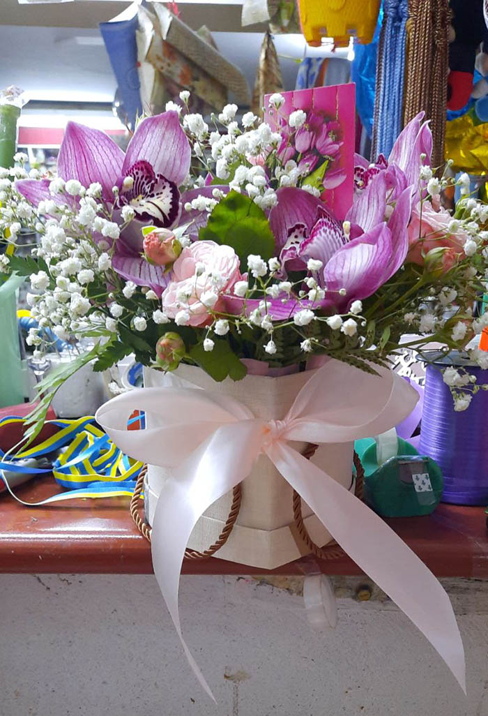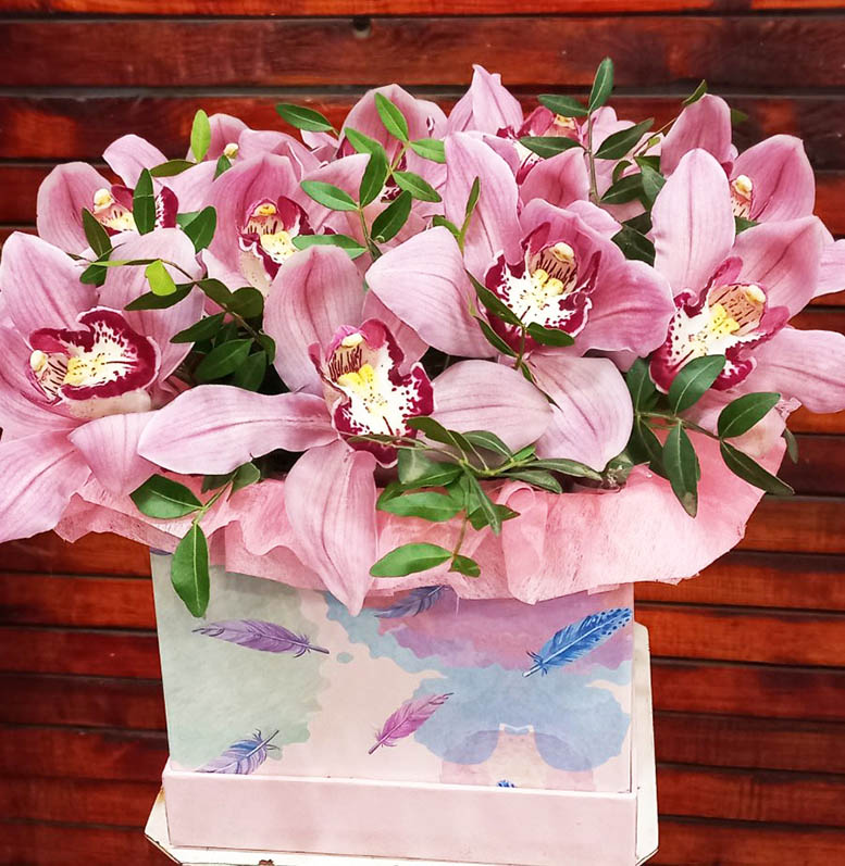 The color of orchids can be from a very light pink (almost white) to dark pink (it also depends on the supplier and availability at the moment), however we always try to provide arrangement to be as close to our main photo as possible.
