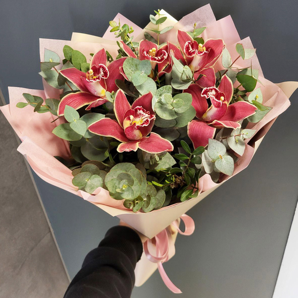 The bouquet of the majestic orchids with eucalyptus and/or other greeneries. The color of flowers can be from light pink to dark pink upon availability at the moment that yoiur order arrives.