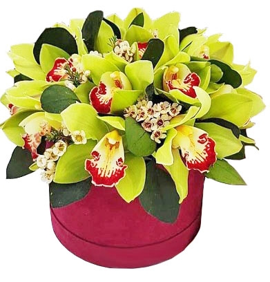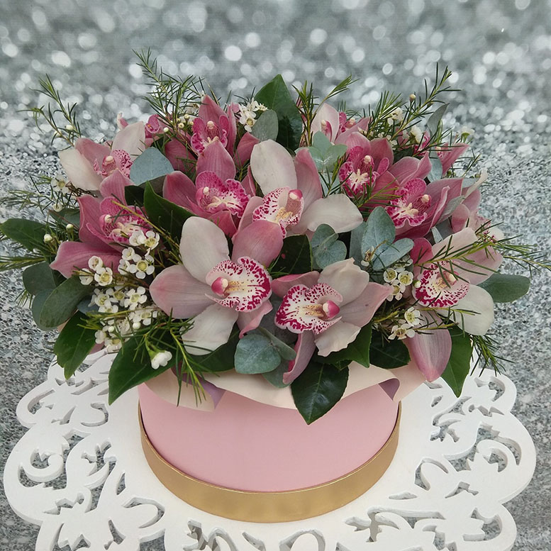 Our photo shows Premium 19 orchids - cymbidiums at the gift hat-box. However you could order a smaller arrangement.