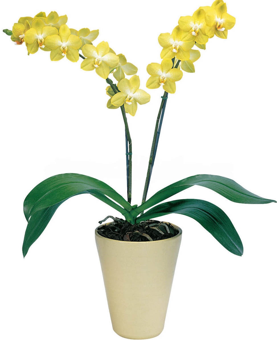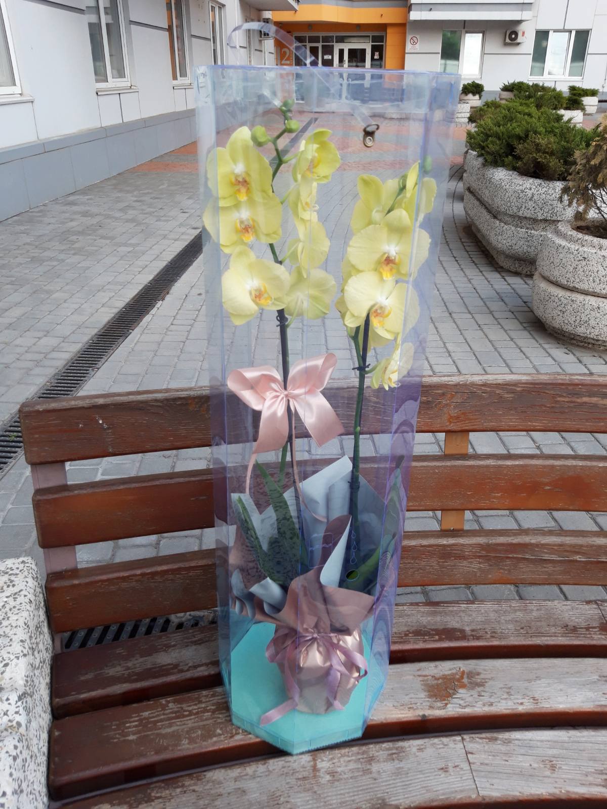 Yellow orchid with 2 flowering branches in a plastic conteiner