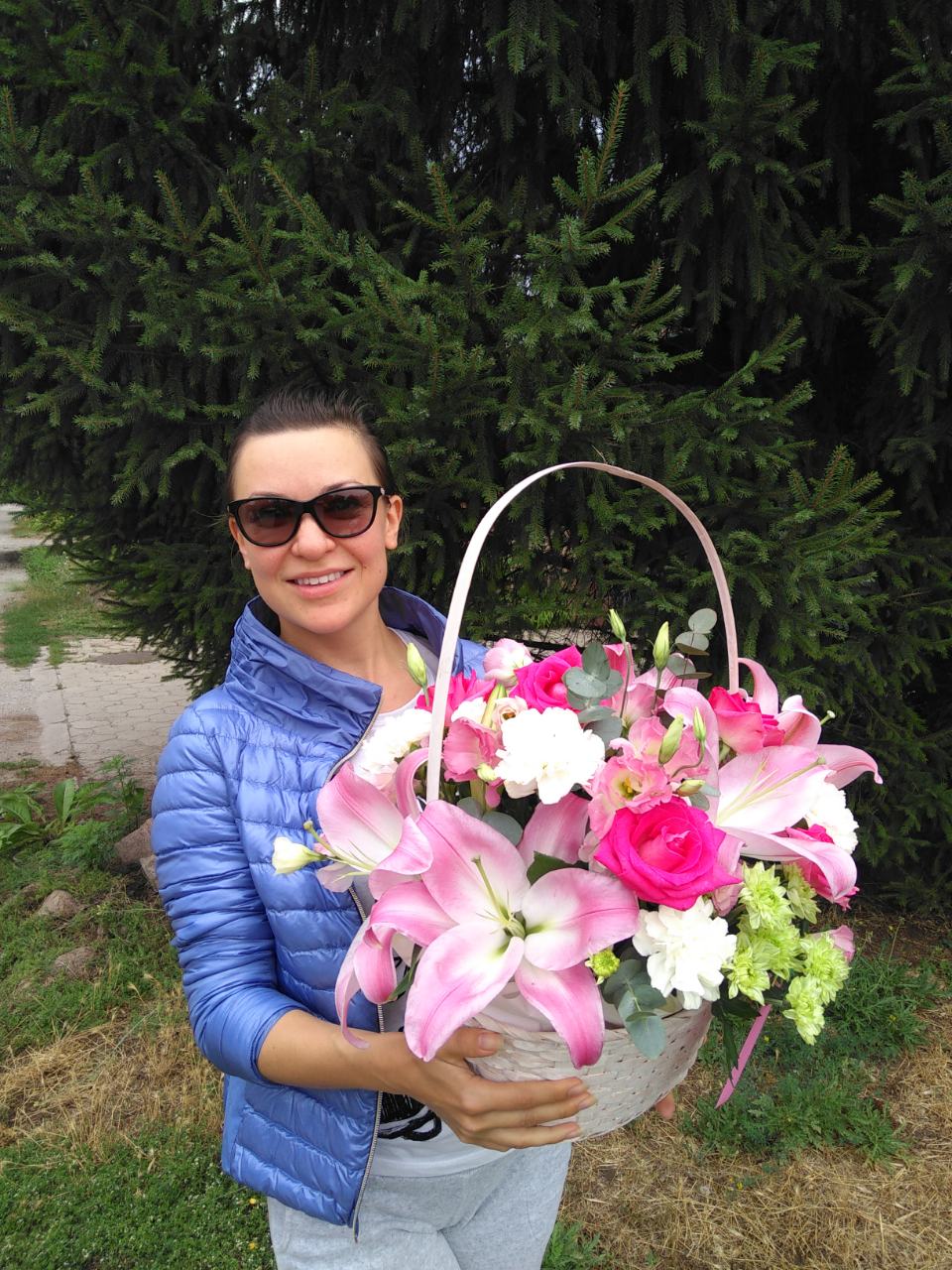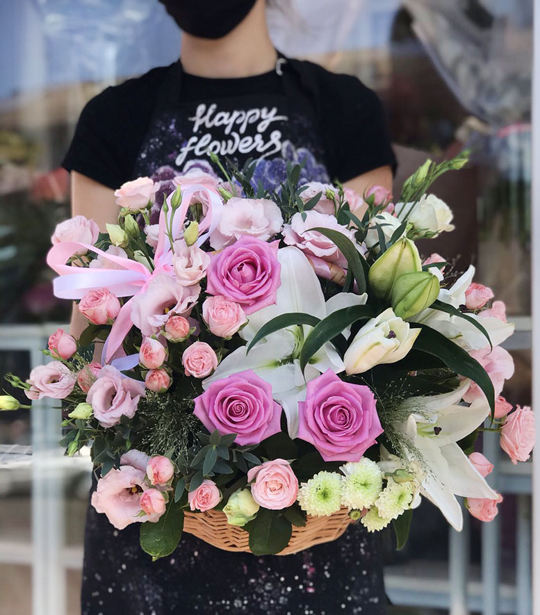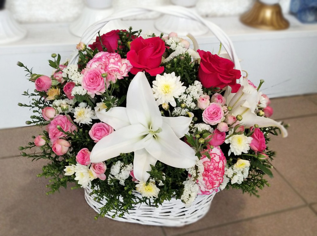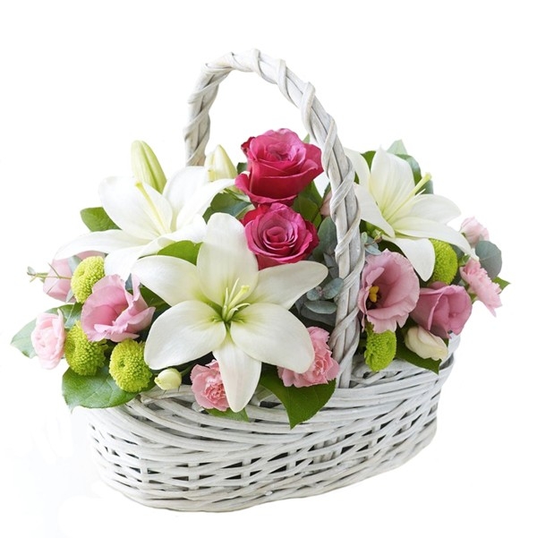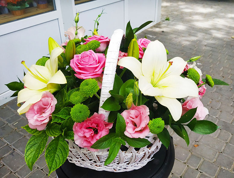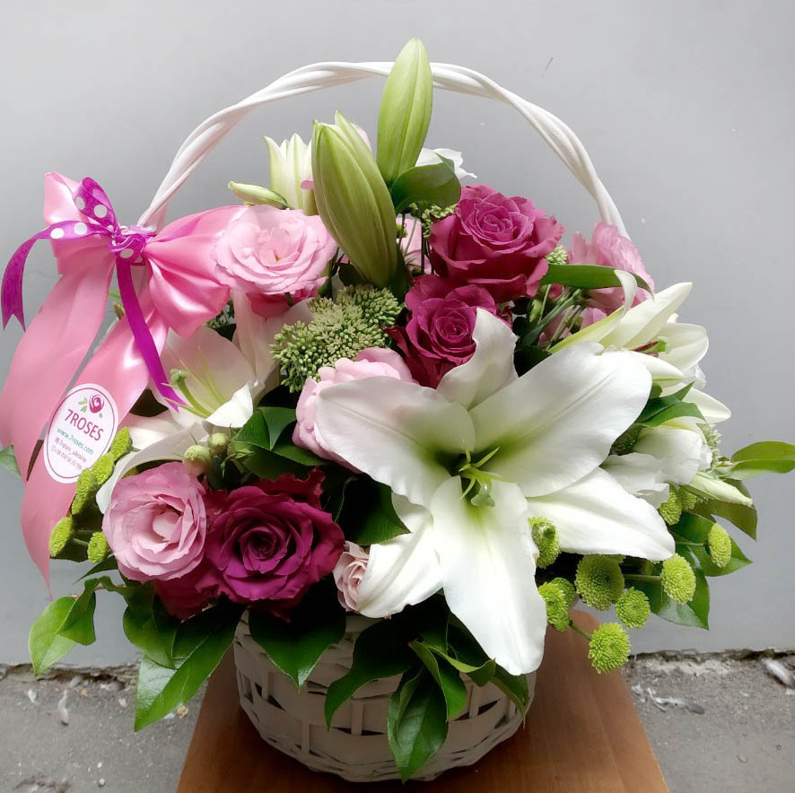 Magnificent cold beauty of lily is warming by a pink roses, carnationss and refreshing by a violet eustoma flowers. They are presented on a shadow of green chrysanthemums, arranged at a basket.