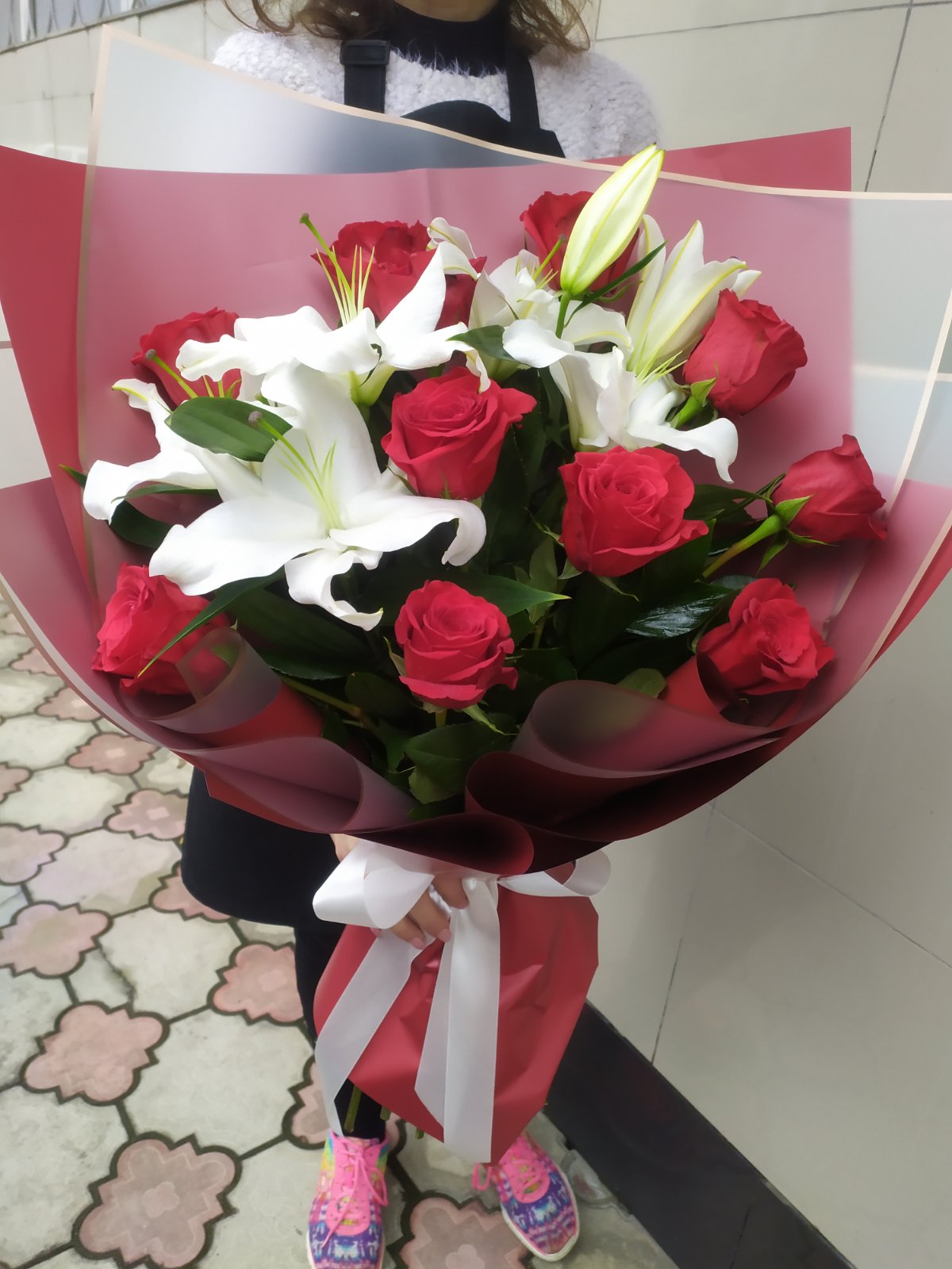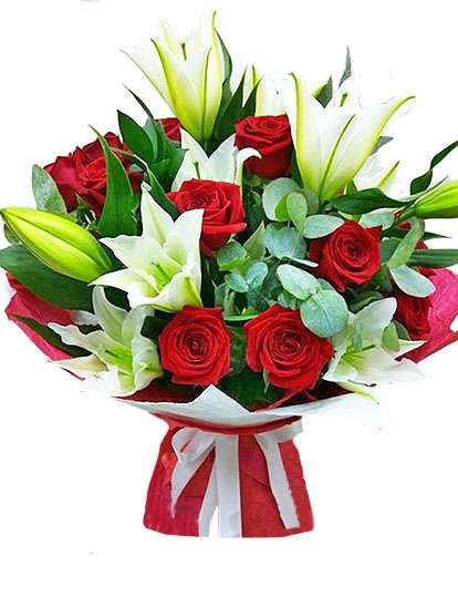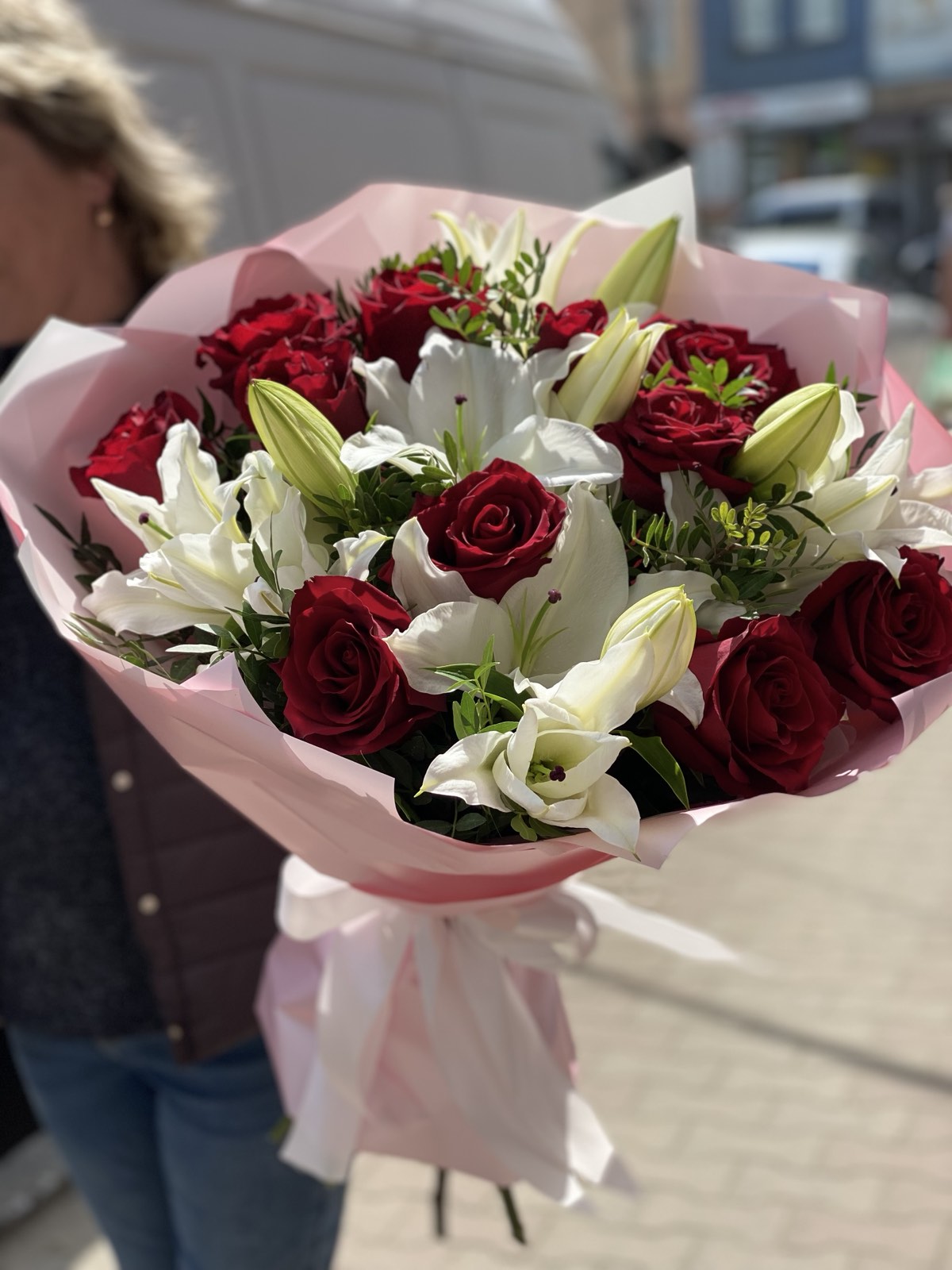 A pure tenderness of a white lily and red rose like a sweet morning kiss of a beautiful seemly maiden.