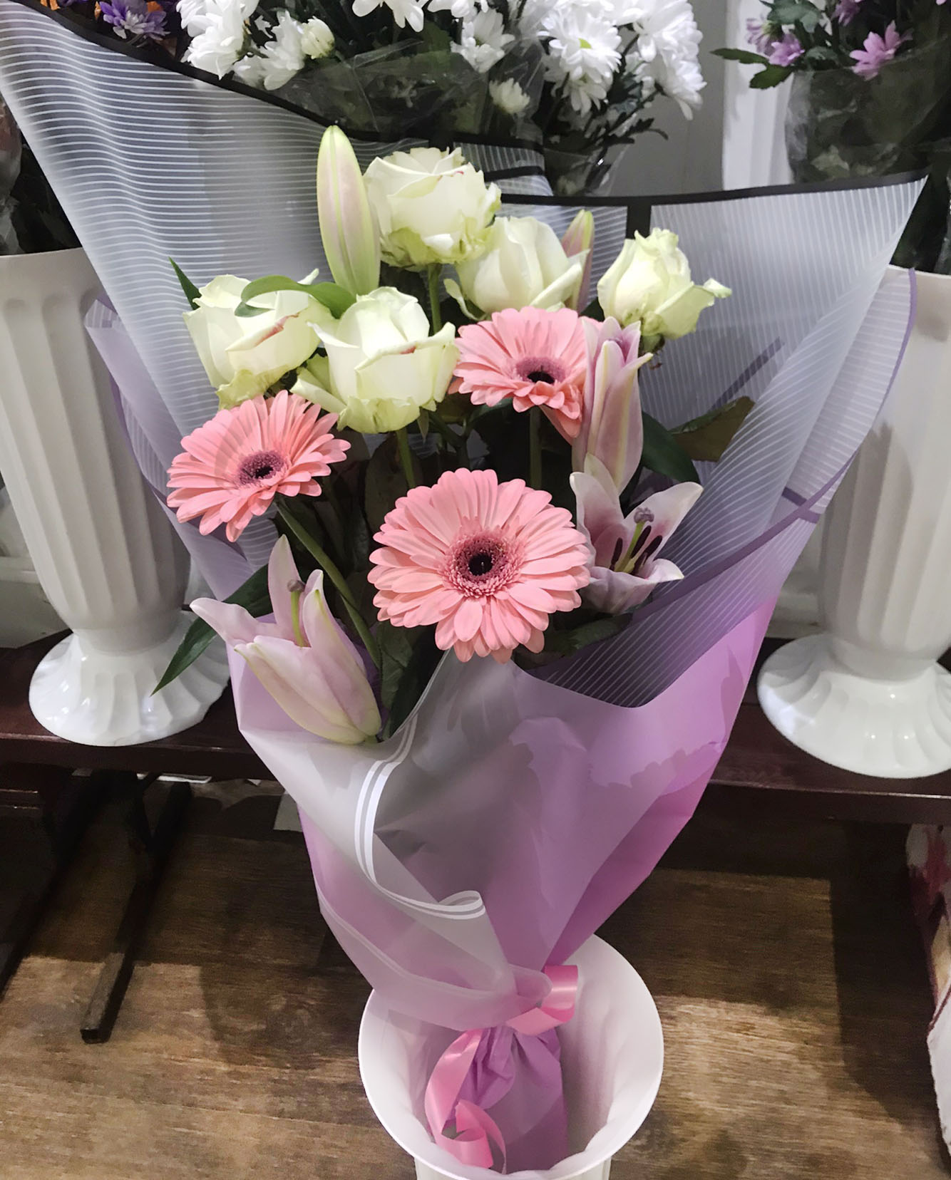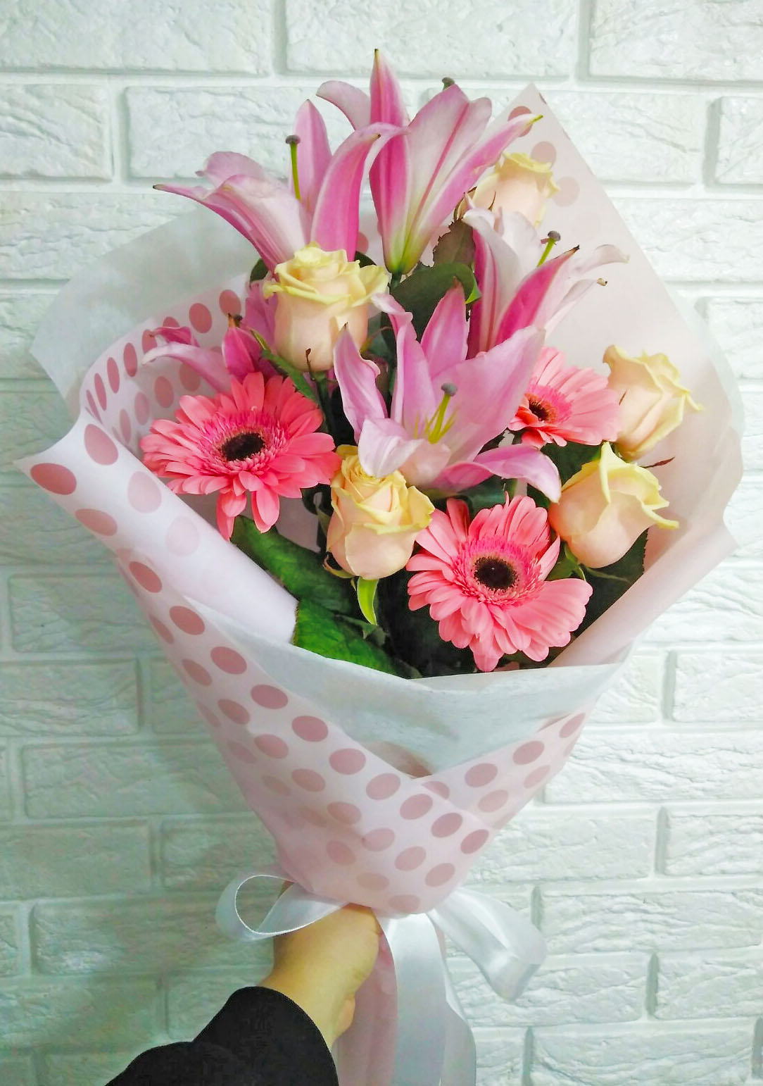 An elegant pink-pastel color bouquet of lilium, 5 roses, 3 pink gerberas or pink roses.