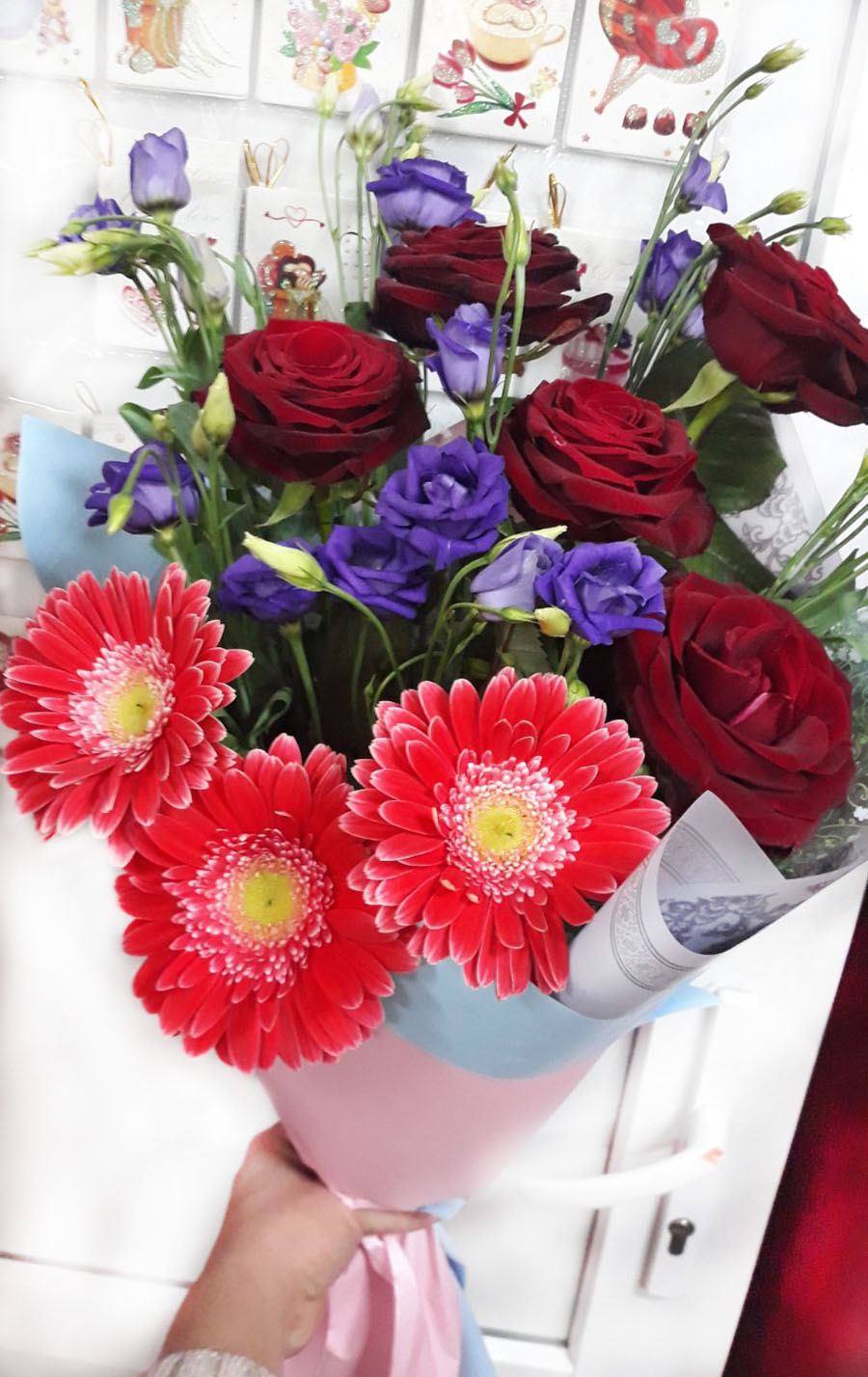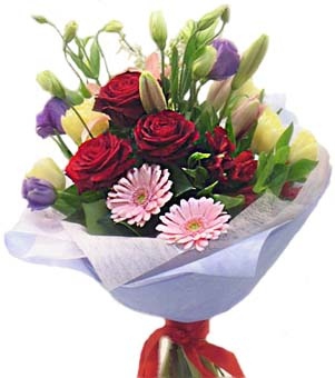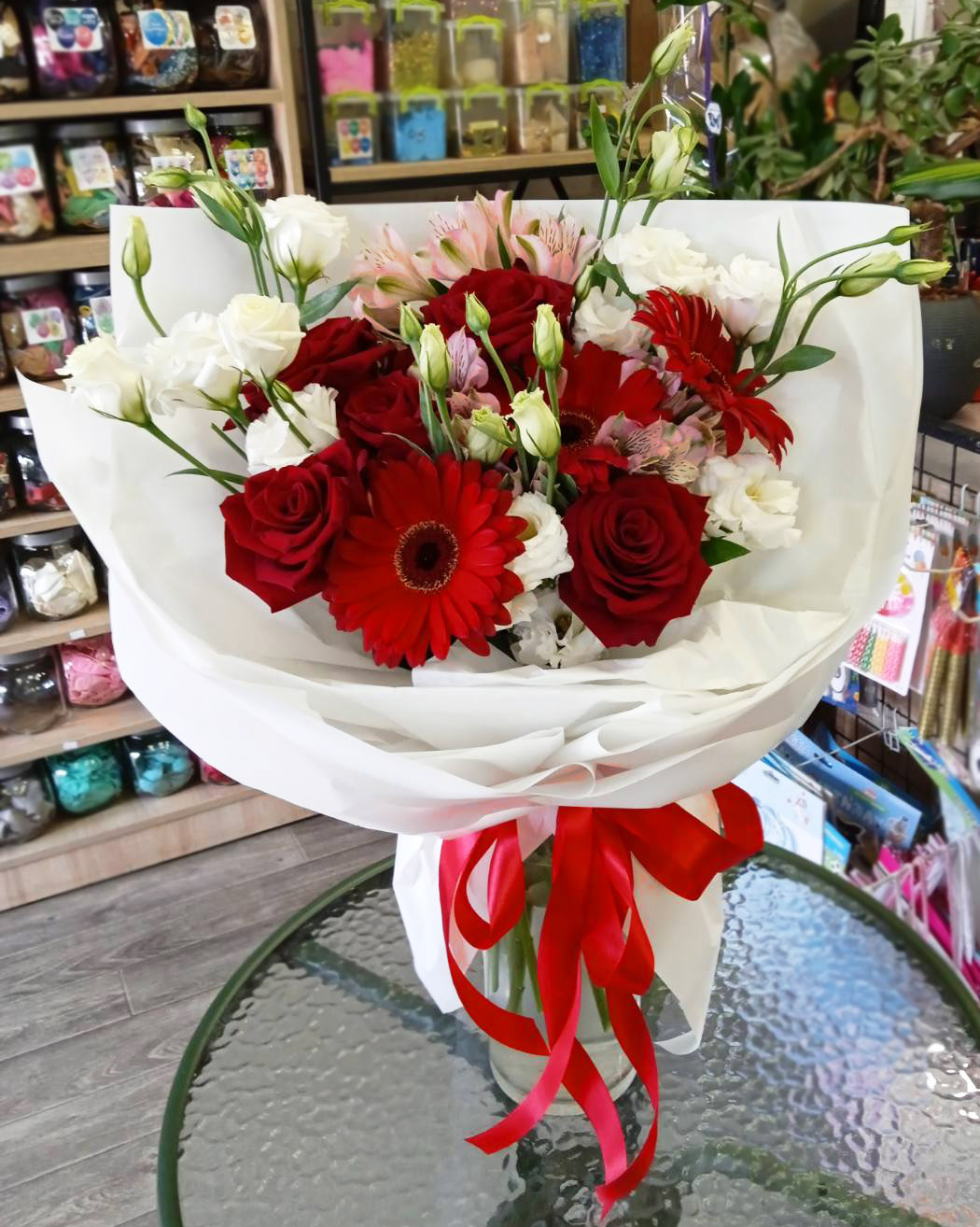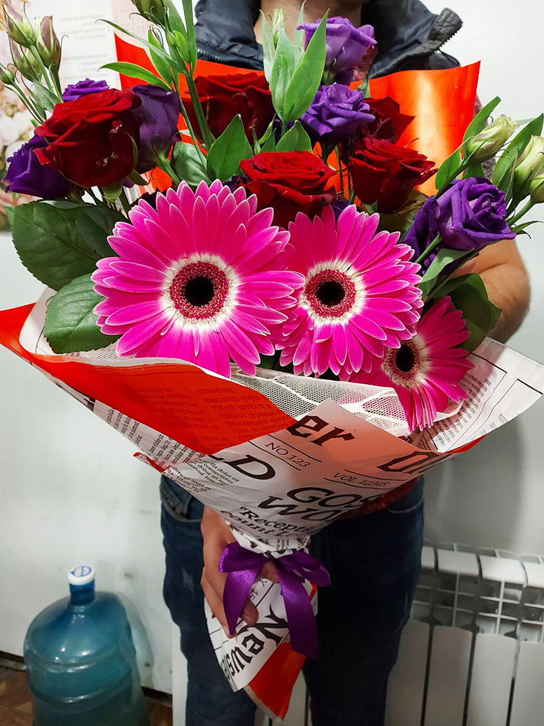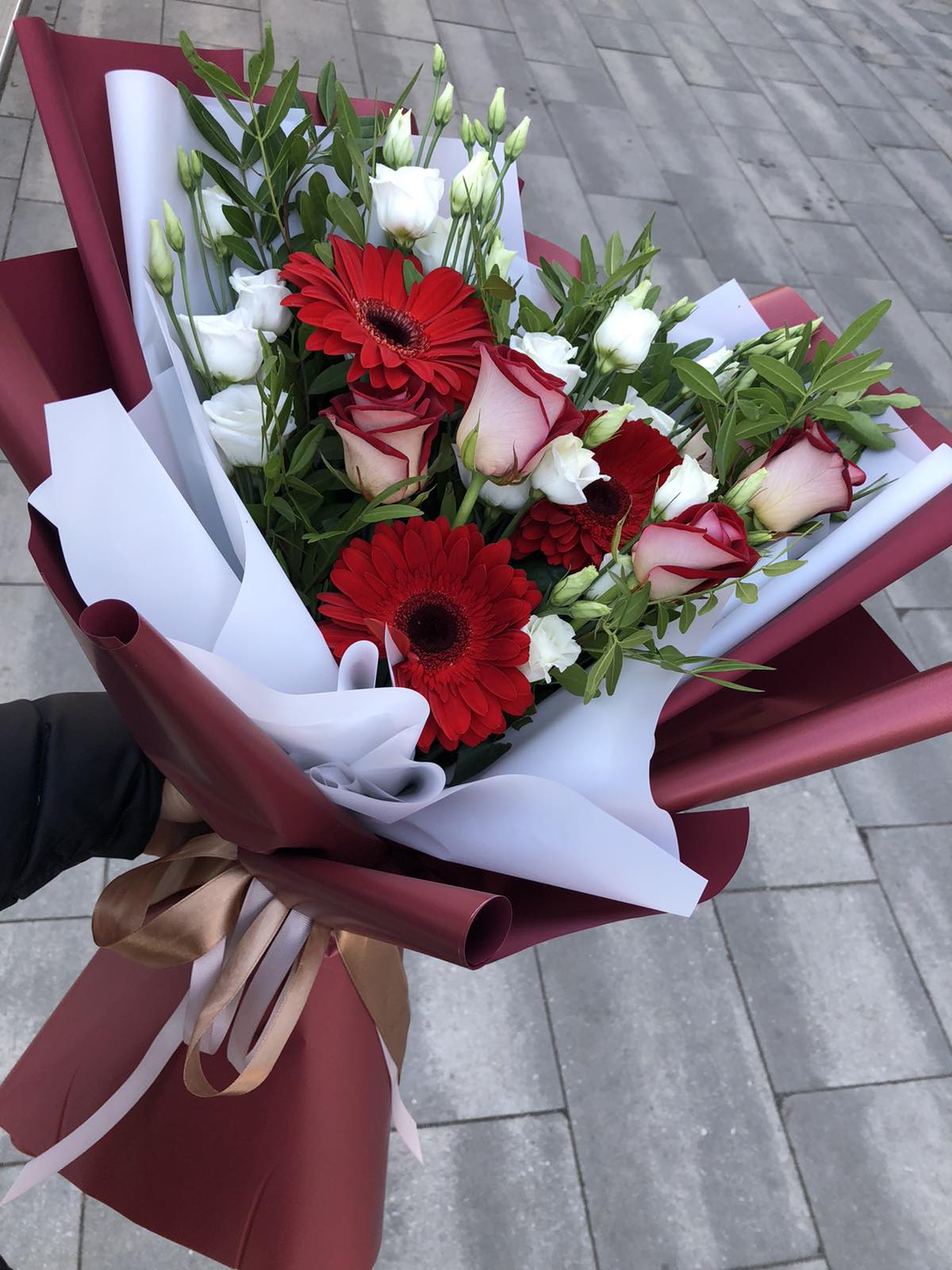 Deep red roses with tender gerberas and airy eustoma flowers