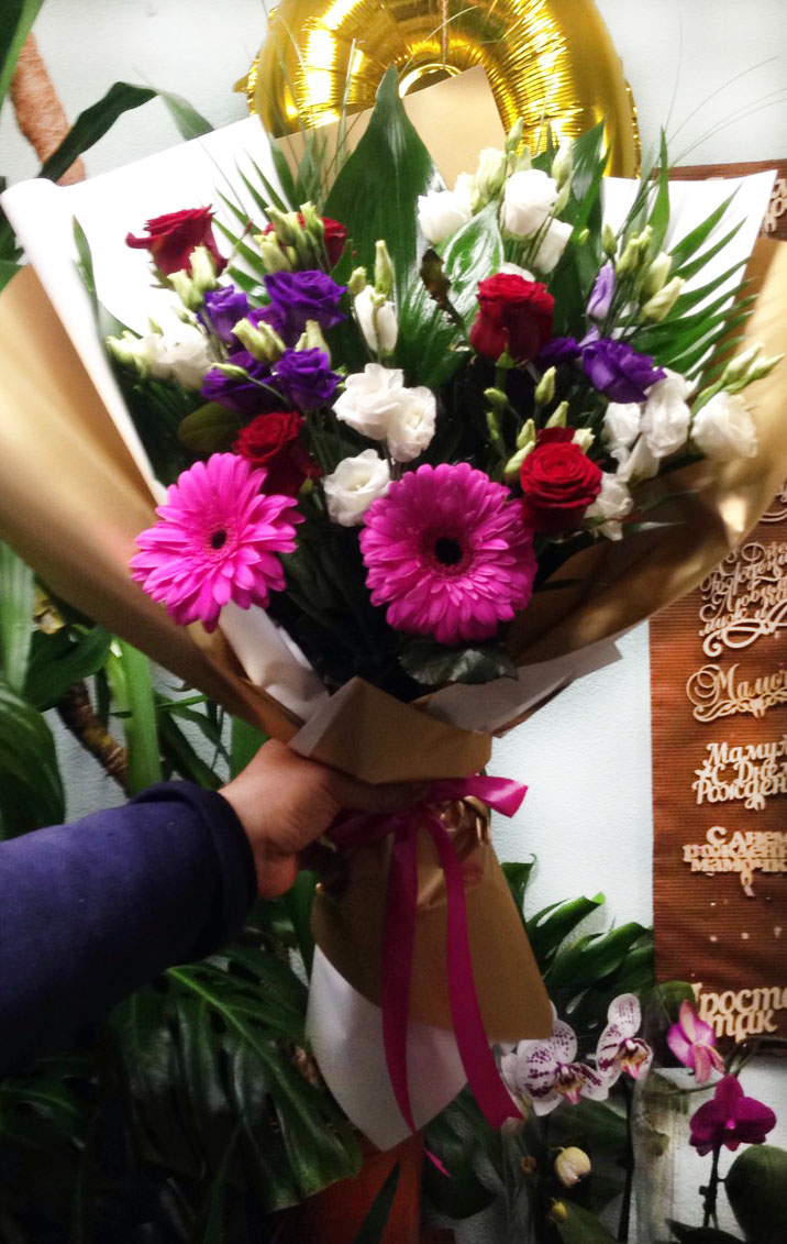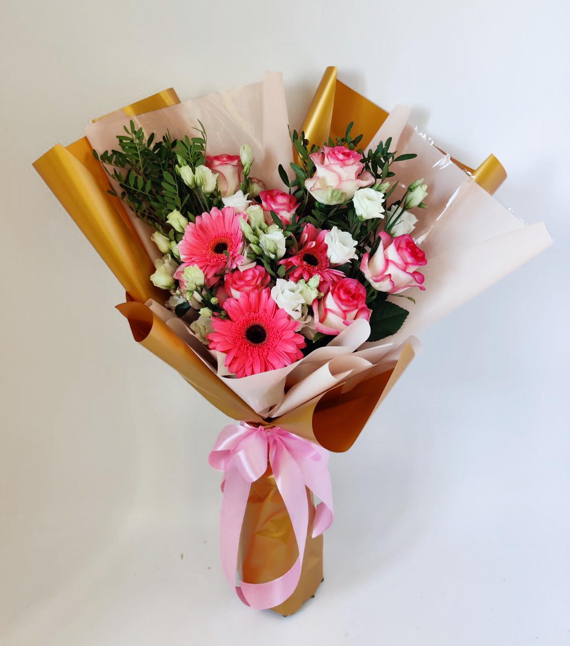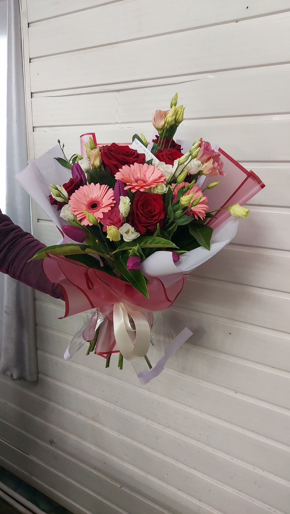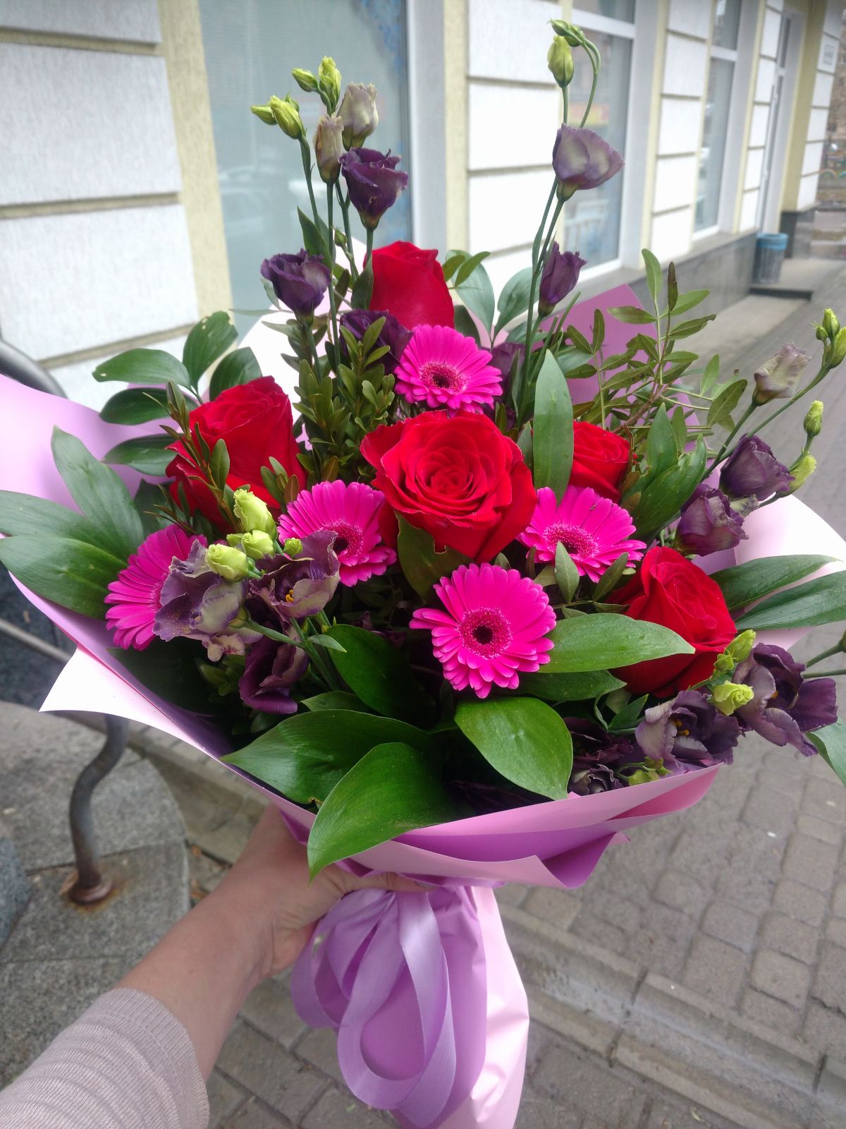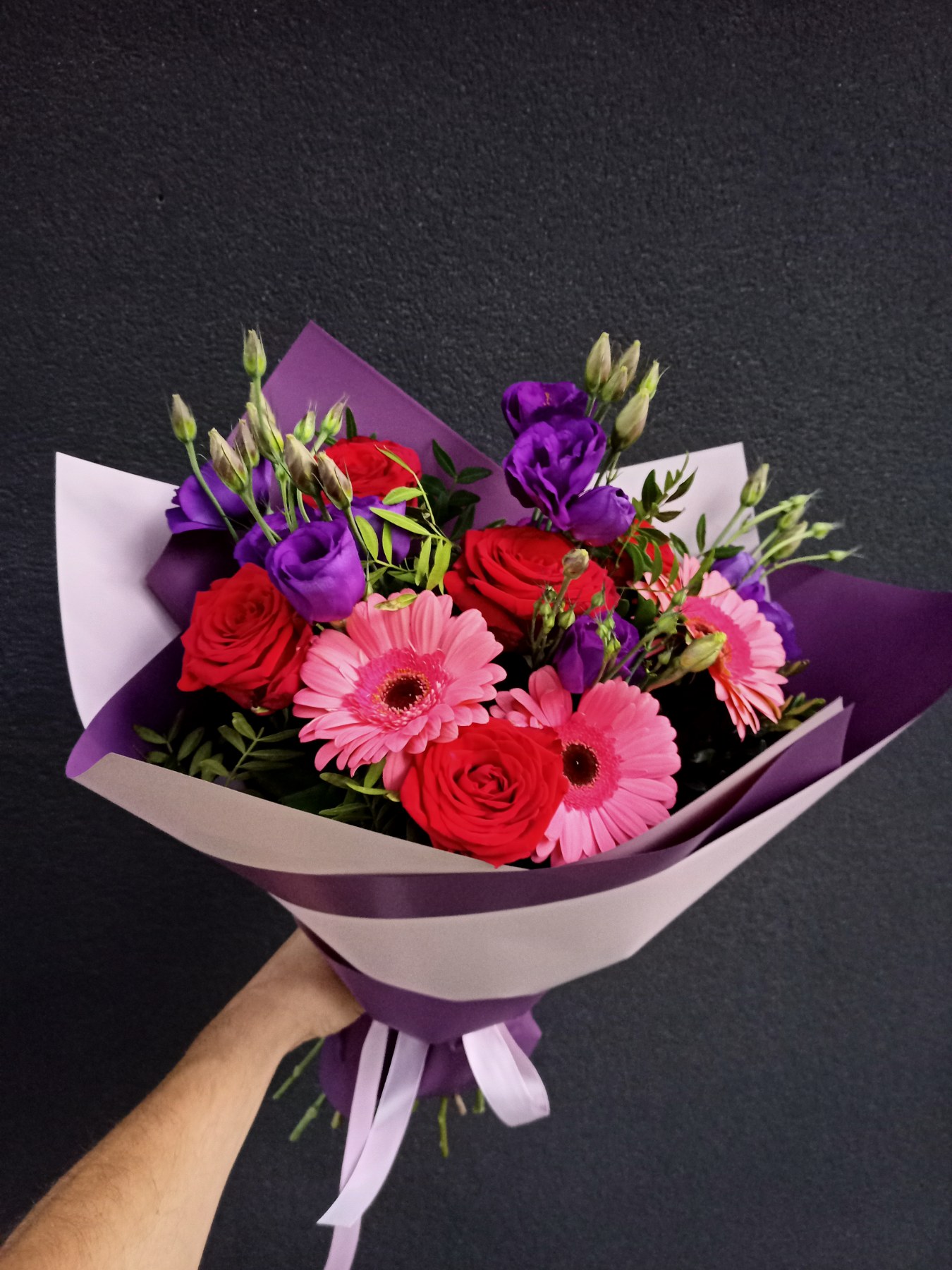 Deep red roses with tender gerberas and airy eustoma flowers