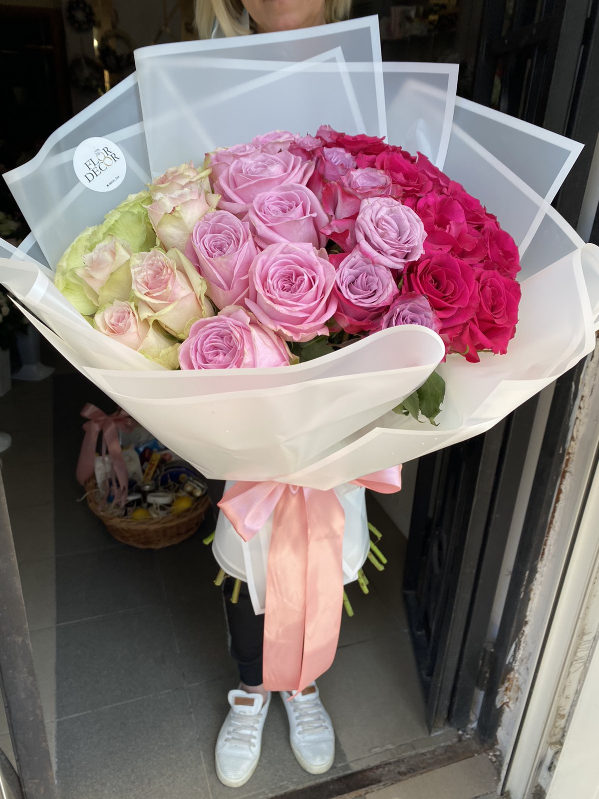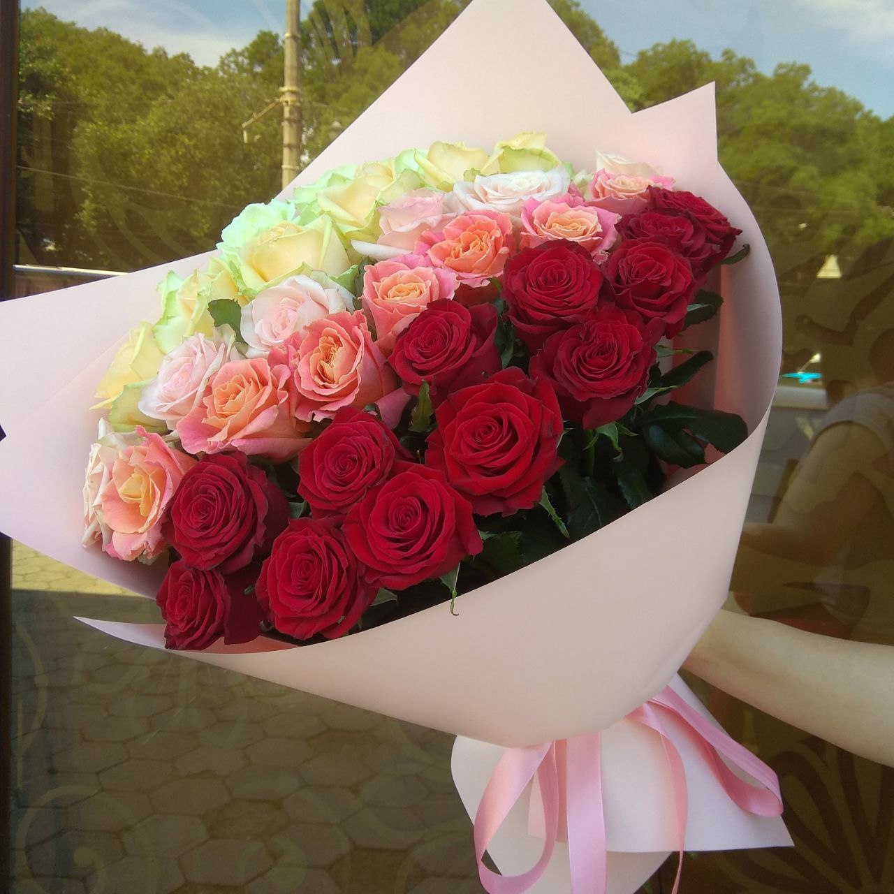 The nuance depends on the roses selection at our flower shop at the moment.