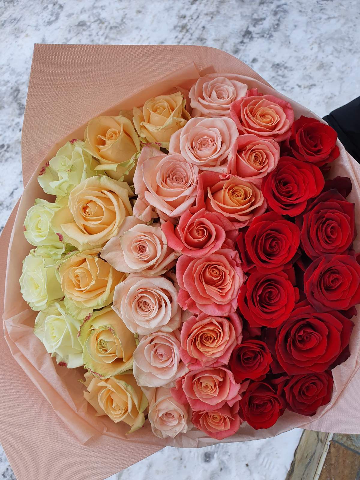 Smooth color transition from white - yellow - coral - pink - red - deep red roses!