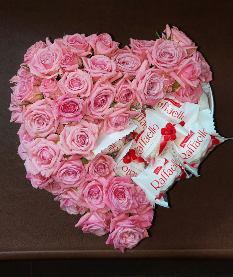 A charming arrangement of pink spray roses and tender Rafaello candies that are loved by any one!!