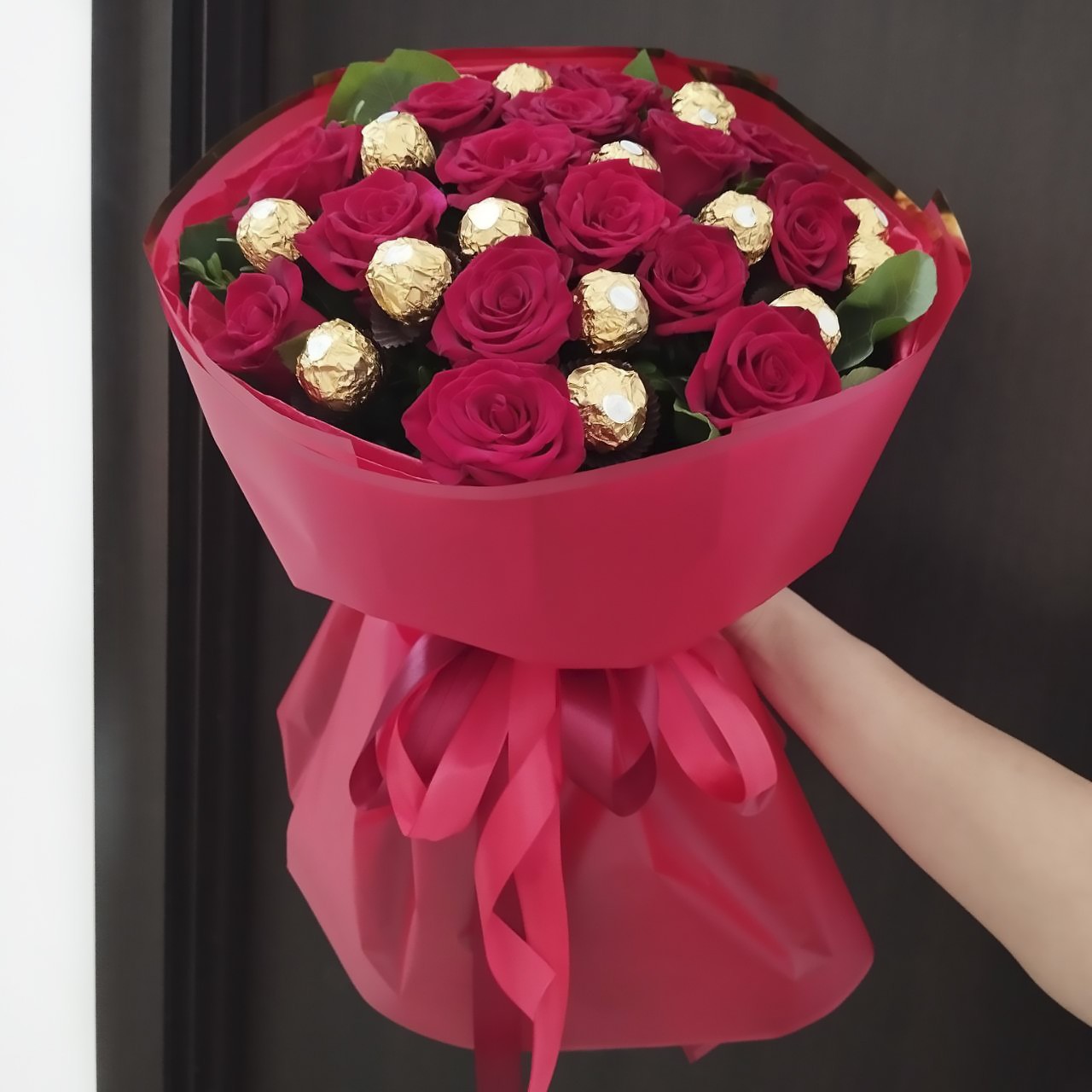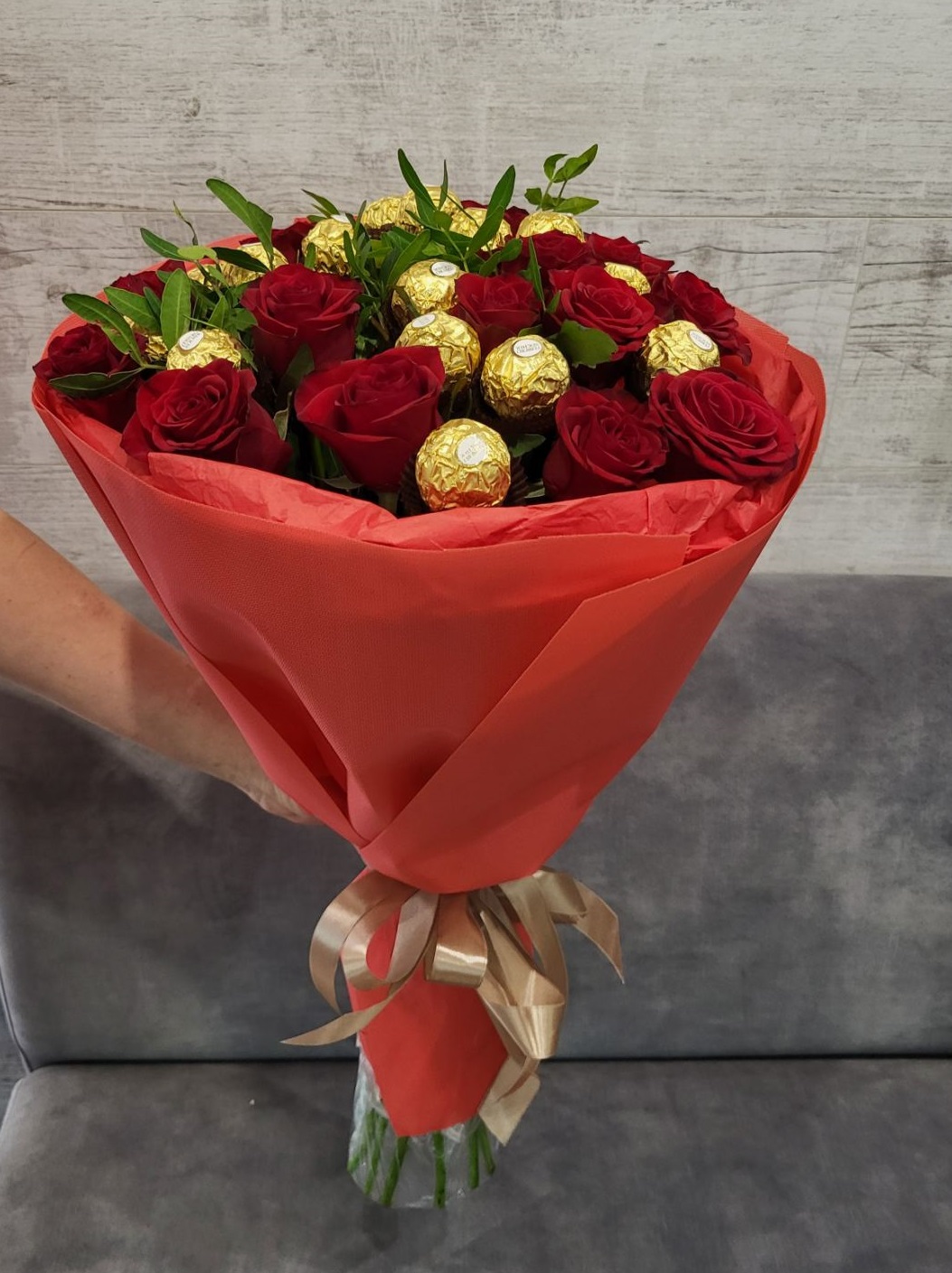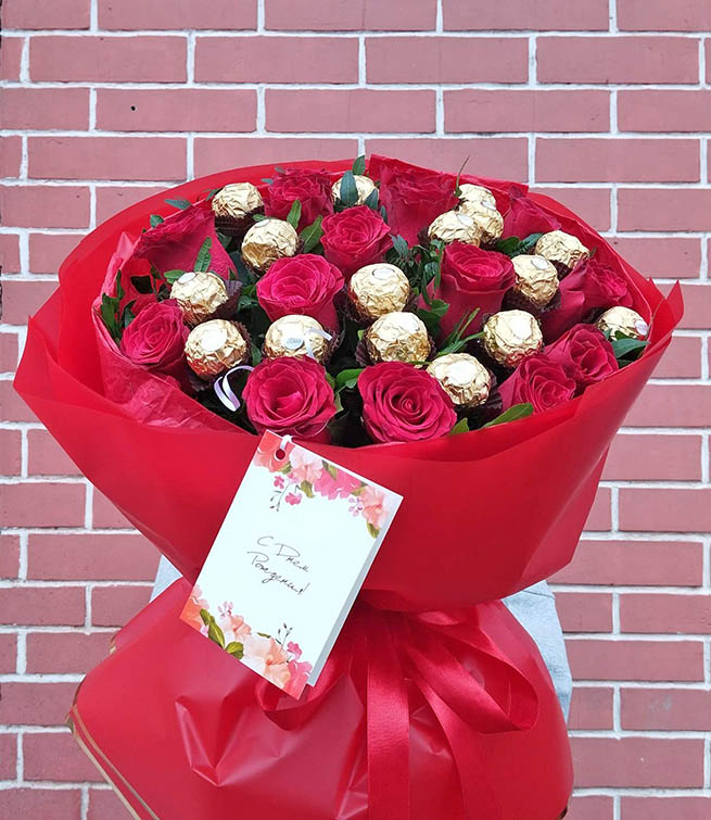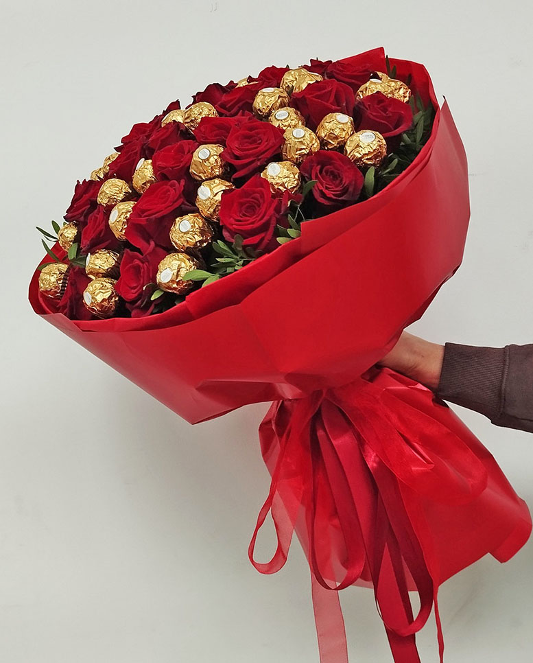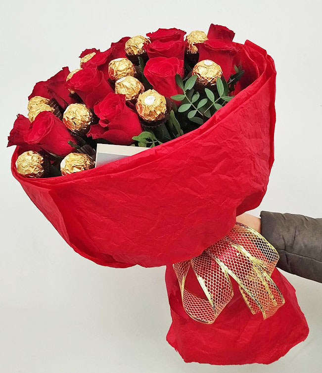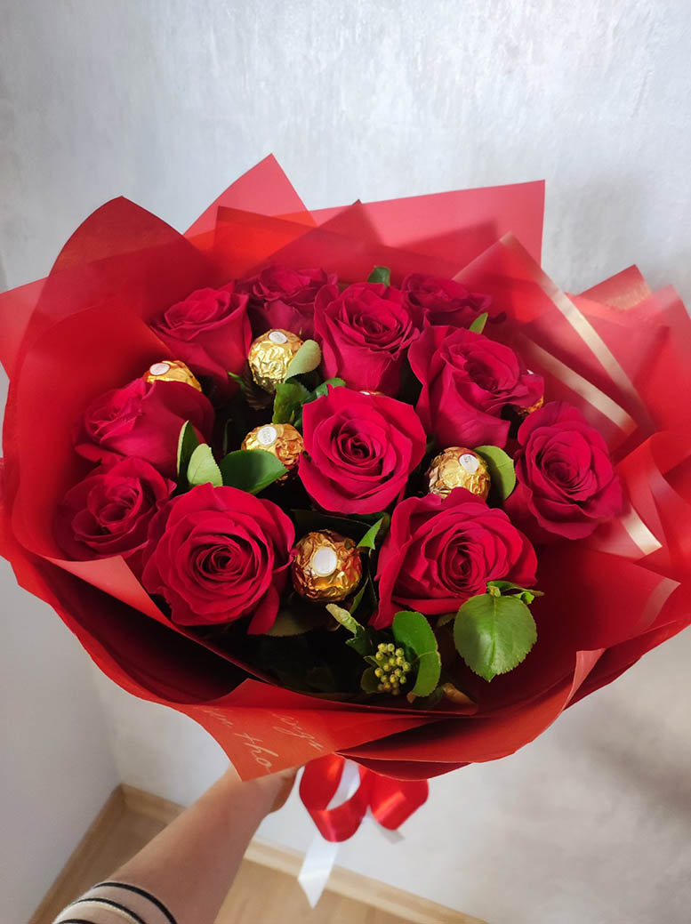 Our photo shows 15 roses +16 Ferreros bouquet, but you could order a smaller or a bigger one.